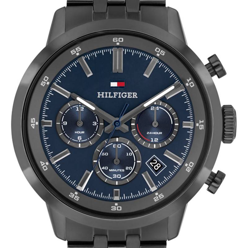 Le cadran de la montre Tommy Hilfiger Kent est une véritable œuvre d'art en miniature. Arborant une teinte bleue intense, sa finition soleillée capte la lumière sous différents angles, créant des jeux d’ombres et de reflets qui captivent le regard. La lisibilité est optimisée grâce à des chiffres arabes et des index bien définis, accompagnés d'un chemin de fer des minutes, qui assurent une lecture rapide et précise de l'heure. Les aiguilles centrales, larges et luminescentes, argentées, glissent avec élégance sur la surface du cadran, marquant les heures, les minutes et les secondes avec une précision infaillible. De plus, le cadran intègre trois compteurs additionnels pour les fonctions chronographes (12 h, 24 h, 60 mn), ainsi qu’un guichet pour l'affichage jour.
