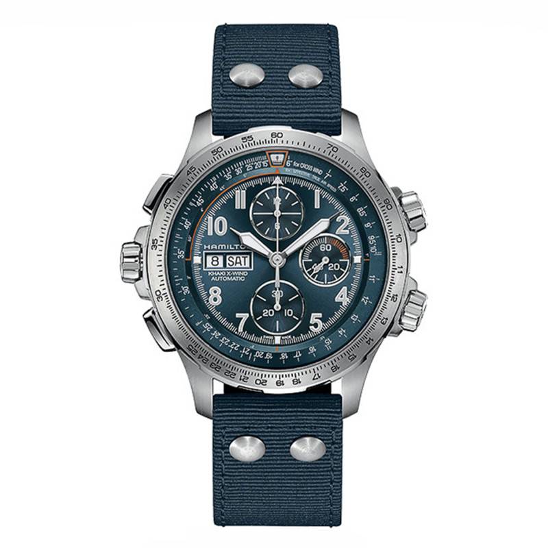 Venant prolonger l'élégance de la couleur bleue du cadran, un bracelet en textile de la même teinte vient supporter de part et d'autre le boîtier de la Khaki Aviation X-Wind Automatic Chronograph H77916920. Mesurant 22 millimètres de large, il n'aura aucun mal à vous accompagner où que vous alliez grâce à son fermoir boucle ardillon en acier inoxydable argenté.