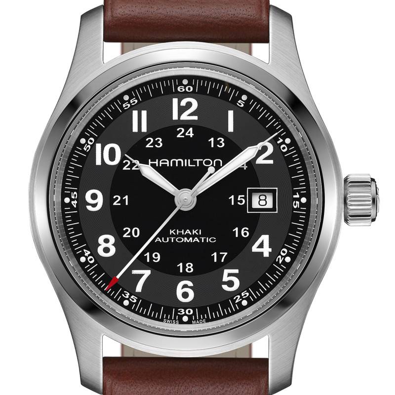 Le cadran de la montre est de forme ronde et présente une jolie couleur noire. Les heures sont marquées par des chiffres arabes de couleur blanche. Sur le pourtour du cadran, un chemin de fer des minutes est inscrit en blanc. Il se marie parfaitement avec les aiguilles seringues qui indiquent les heures ainsi que les minutes et présentent un revêtement luminescent afin de vous informer de l'heure même dans les milieux les plus obscurs. Une graduation d'heure militaire est inscrite sur le cadran. Un guiche date est présent à 3 heures. Le nom de la maison horlogère est positionné à 12 heures et à son opposé vous retrouverez la mention "Khaki Automatic" faisant référence au type de mouvement présent à l'intérieur du boitier.