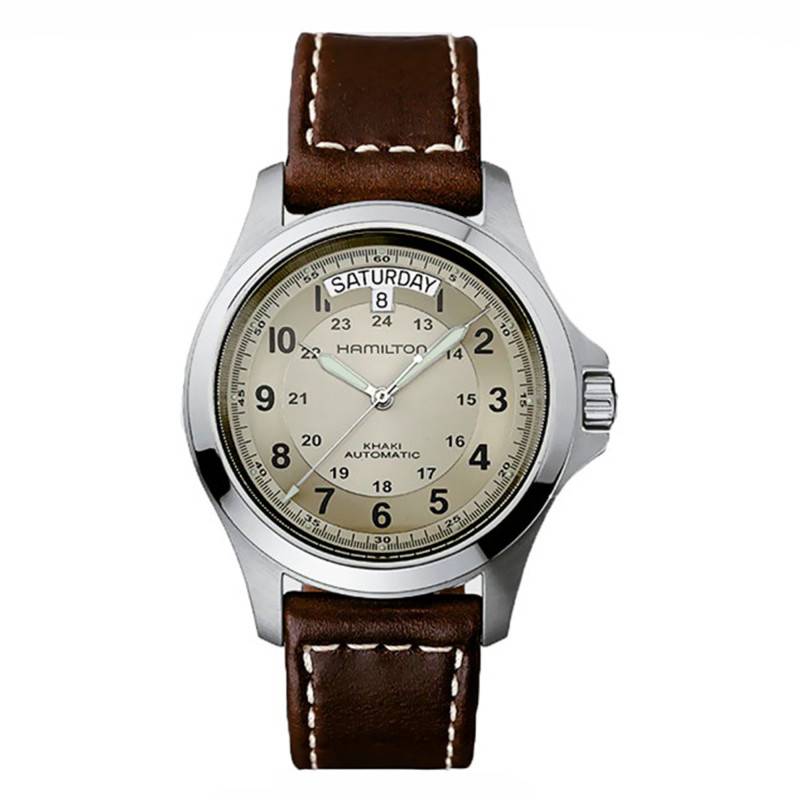 Automatique, le mouvement embarqué dans le boitier est un mouvement H-40 de la maison Hamilton. Suisse, il est basé sur un calibre de la maison ETA, et plus particulièrement, le calibre 2834-2. Les modifications de la maison Hamilton permettent de pousser sa réserve de marche à 80 heures. Il vous propose une fréquence d'oscillations de 21.600 alternances par heure, ainsi qu'un total de 25 rubis. Il vous offre, avec fiabilité et précision, les fonctions heures, minutes, secondes, date et jour.