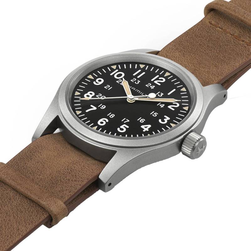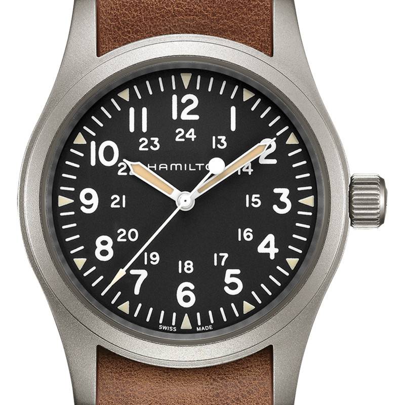 À travers sa collection Khaki Field, Hamilton a su créer une gamme composée de montres au style typiquement vintage et militaires, au mouvement mécanique et avec un excellent rapport qualité/prix. C'est d'ailleurs l'une des gammes les plus importantes de la marque Hamilton aujourd'hui dans son catalogue. Son boitier en acier inoxydable de 38mm de diamètre pour 9,5mm d'épaisseur en font un petit format discret et confortable au poignet. Elle est munie d'un verre saphir pour la protéger, très appréciée et réputée pour sa très forte résistance aux rayures, permise notamment par sa grande dureté. La couronne se place, comme traditionnellement dans l'horlogerie, à 3h et sachez que le fond du boitier est vissé pour une étanchéité de 5 atmosphères. En somme, un modèle soigné et solide qui rend hommage de la plus belle des manières aux historiques de la marque.