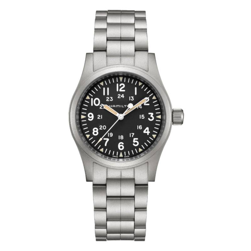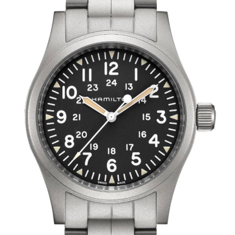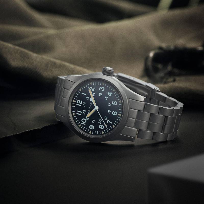 Un mouvement mécanique suisse de calibre Hamilton H-50 à remontage manuel équipe ce modèle. Avec une réserve de marche de 80 heures, il vous orientera dans le temps avec précision et durabilité.