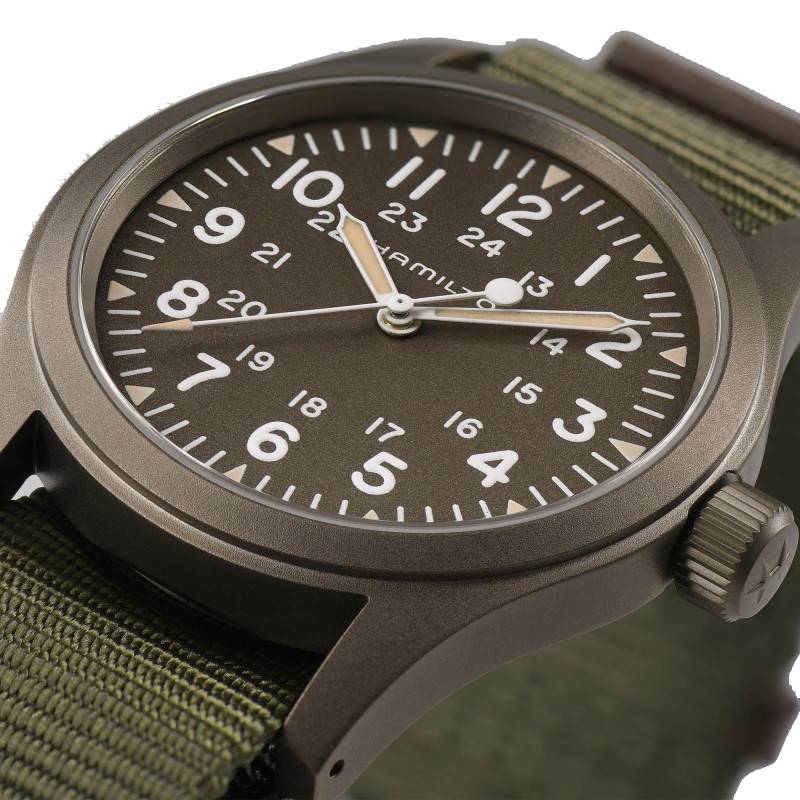 Hamilton a opté pour un modèle assez original avec ses couleurs à l'allure militaire. Ce garde-temps sait rester tout de même assez discret et s'accorde alors avec l'ensemble de vos tenues vestimentaires. Deux aiguilles bicolores blanches et beiges vous indiqueront les heures et les minutes. La trotteuse de couleur blanche se distingue par sa subtilité et vous donnera les secondes de manière très précise. Des chiffres arabes de couleur blanche apparaissent toutes les heures sur le cadran. Ils ont une typologie assez importante pour que vous puissiez les distinguer facilement. Ils sont accompagnés par un chemin de fer des minutes qui se forme sur le pourtour du cadran. Des index en forme de triangles de couleur beige marquent les heures de façon discrète. La manufacture horlogère précise que ce garde-temps est totalement Swiss Made aux environs de 6h. Enfin, la marque signe son oeuvre à 12h en lettres capitales de couleur blanche.
