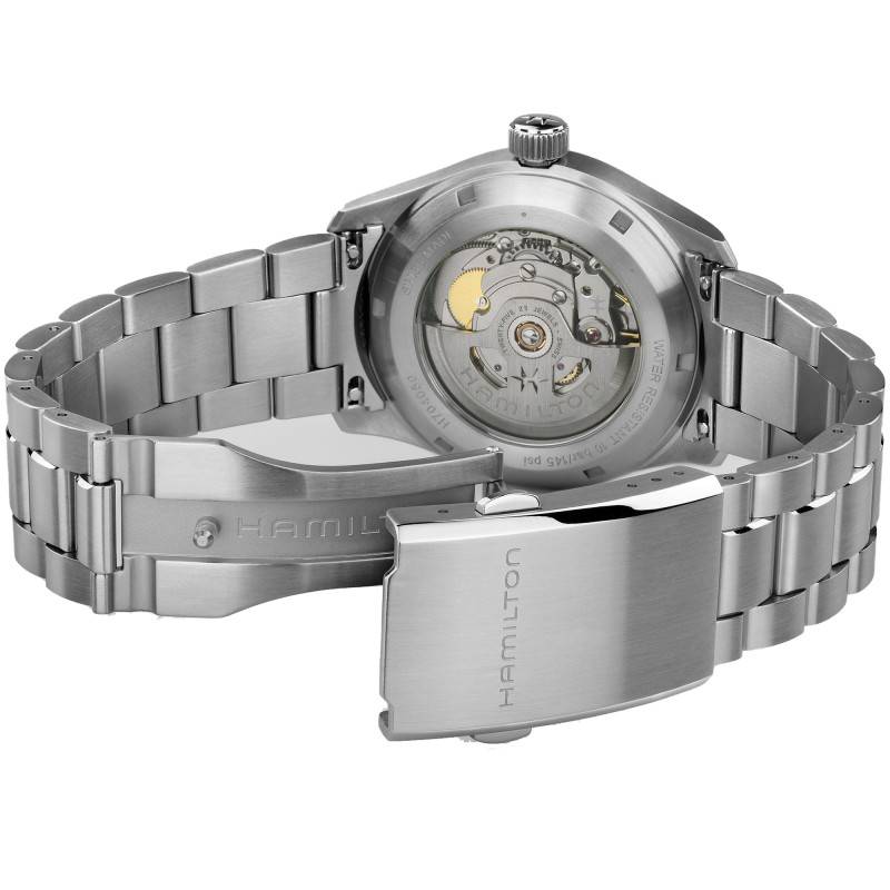 La marque Hamilton se distingue à travers ses fabuleux garde-temps à la fois charmants et fiables. Ses montres sont réalisées à partir de matériaux solides pour une durabilité impressionnante avec des designs soignés apportant une belle allure et des mécanismes de pointes assurant une précision au quotidien. Aujourd'hui, elle a le plaisir de vous présenter la montre Khaki Field Murph Auto 38 mm H70405130 destinée à la gent masculine. Captivante, elle reprend fidèlement la montre portée par Murph, le personnage principal du film Interstellar sorti en 2014. Elle se pare d'un boîtier rond façonné en acier inoxydable brossé et poli. Il est robuste et affiche 38 mm de diamètre pour une épaisseur de 11,10 mm. Il est muni d'une couronne grise et crantée favorisant une bonne prise en main dont le rôle est de manipuler les éléments centraux. Ces derniers sont surmontés par un verre saphir antireflet garantissant une lisibilité sans contrainte et qui les protègent des chocs potentiels. Ce garde-temps est doté d'un fond de boîte vissé et transparent assurant une étanchéité de 10 ATM. Grâce à son ouverture, vous pourrez admirer les oscillations de son mouvement.