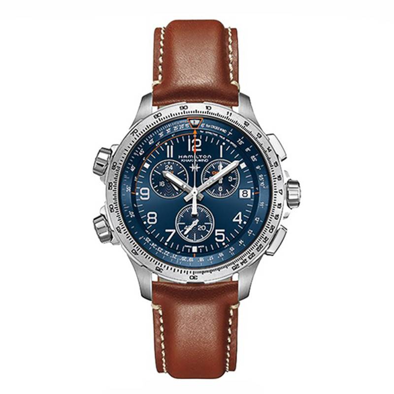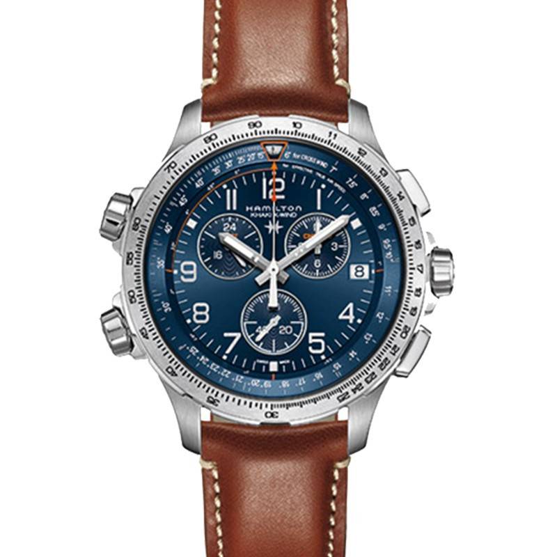 C'est un cadran rond de type aviateur au fond bleu qui va caractériser cette Khaki X-Wind. Les deux aiguilles des heures et des minutes sont argentées et sont revêtues d'une fonction luminescente pour voir de façon idéale, même dans le noir. La troisième aiguille, avec la pointe orange, est l'aiguille des 60 secondes du chronographe. Pour marquer les heures, des chiffres arabes blancs accompagnés d'un chemin de fer des minutes de la même couleur sont posés sur le pourtour du cadran. Il y a trois compteurs additionnels qui se partagent la surface : à 2h vous avez un compteur 12 heures (heures et minutes), tandis qu'à 6h c'est le compteur de la petite seconde. Enfin à 9h, le deuxième fuseau horaire 24h (GMT) trouve sa place. La date du jour se consulte par un guichet date à 3h.