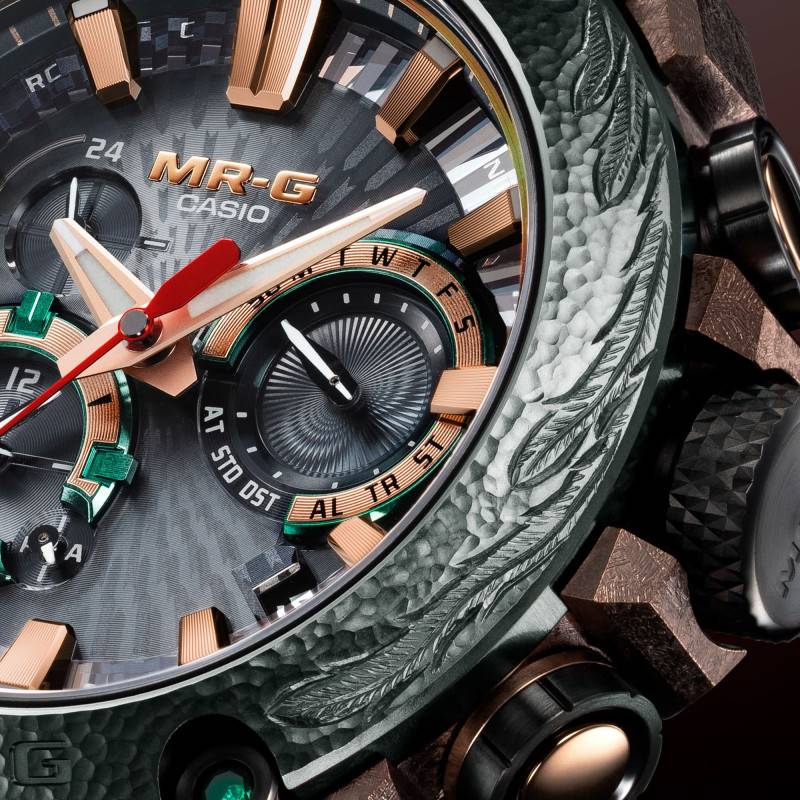 La montre Casio G-Shock Kurogane-Tsuba, référence MRG-B2000KT-3ADR, se distingue par son esthétisme et sa robustesse. Son boîtier rond en titane est sublimé par un revêtement DLC doré rose, offrant une finition d'une exceptionnelle résistance aux rayures et à l'usure. Les couleurs marron, rose et vert confèrent à ce modèle un aspect à la fois vibrant et sophistiqué. Avec un diamètre de 54,70 mm et un poids de 138 g, cette montre assure une présence remarquable au poignet tout en offrant un confort optimal grâce à une répartition équilibrée du poids. La fabrication japonaise garantit une qualité irréprochable et une attention minutieuse aux détails, caractéristiques des produits de la gamme G-Shock. L'édition limitée témoigne d'un savoir-faire artisanal unique, avec seulement 800 exemplaires disponibles dans le monde. La lunette est gravée d'un motif de phénix réalisé à la main par le forgeron Masao Kobayashi, représentant la tête et la queue sur les côtés droit et gauche.