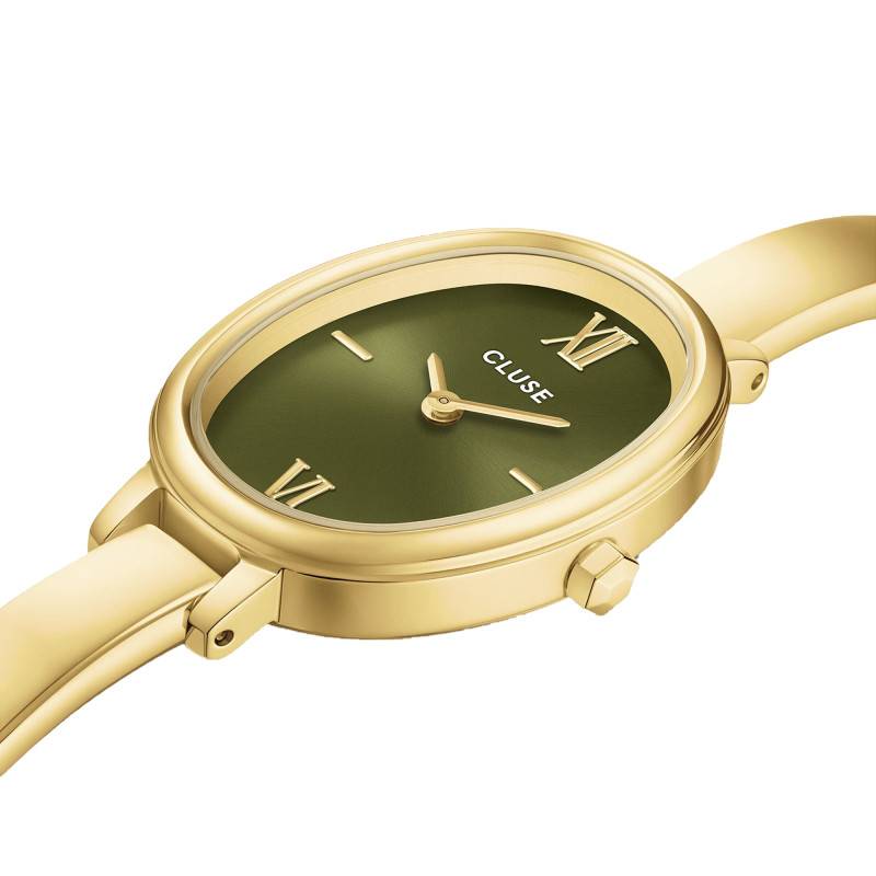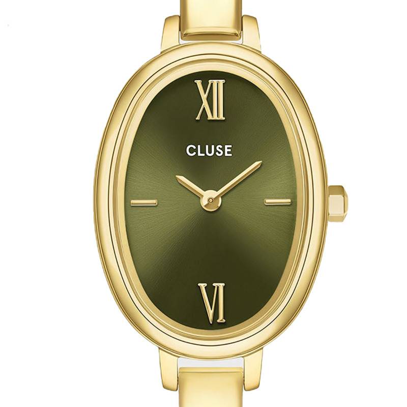 Le cadran de cette montre accentue le prestige par ses nuances vertes et sa finition mate, reflétant une sophistication silencieuse. Les chiffres romains situés à 12h et 6h se distinguent par leur élégance classique, tandis que les aiguilles effilées procurent une lecture facile et rapide du temps. La simplicité de l'affichage, limité aux heures et aux minutes, permet de concentrer l'attention sur les détails esthétiques. Le cheminement minutieux des aiguilles, mû par un mouvement quartz japonais, assure une précision horlogère sans faille, rappelant la maîtrise combinée de la forme et de la fonctionnalité que Cluse incarne.