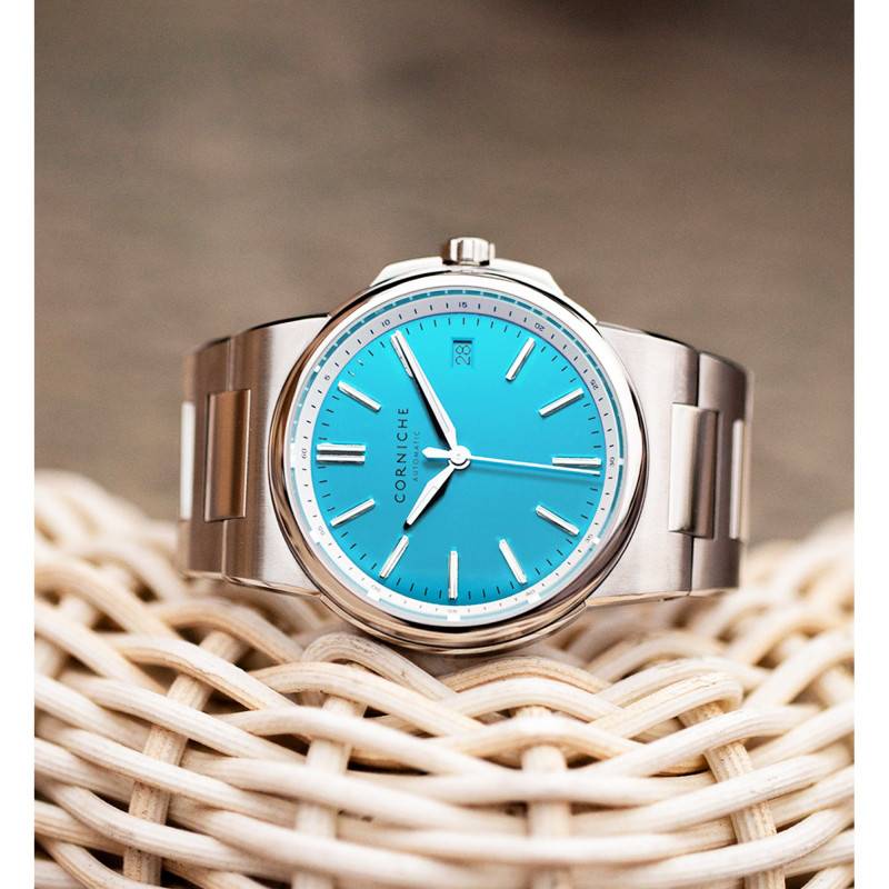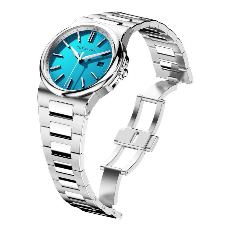 Le cadran de cette montre constitue un véritable enchantement visuel grâce à sa magnifique couleur bleu azur. La finition soleillée sublime la teinte en apportant des reflets lumineux sous différents éclairages. Les index et aiguilles luminescents s'intègrent de façon harmonieuse, facilitant la lecture du temps en toutes circonstances. Ce cadran est méticuleusement organisé avec un chemin de fer des minutes qui assure une lecture précise. À 3 heures, un discret guichet date permet de suivre l'évolution des jours sans perturber l'équilibre esthétique du cadran. En se penchant sur son verre saphir à double traitement antireflets et avec revêtement anti-empreintes, c'est une vision claire et sans obstruction qui s'offre au porteur, même sous une luminosité intense.