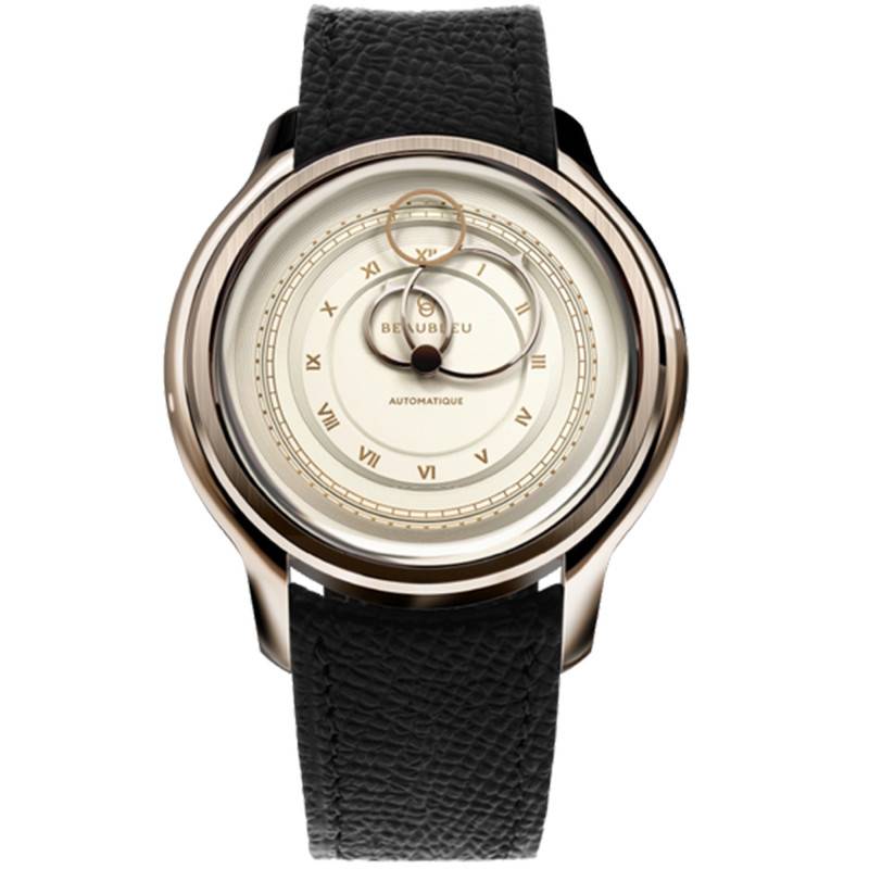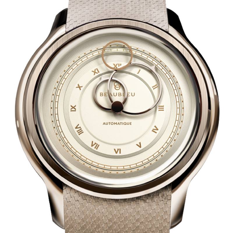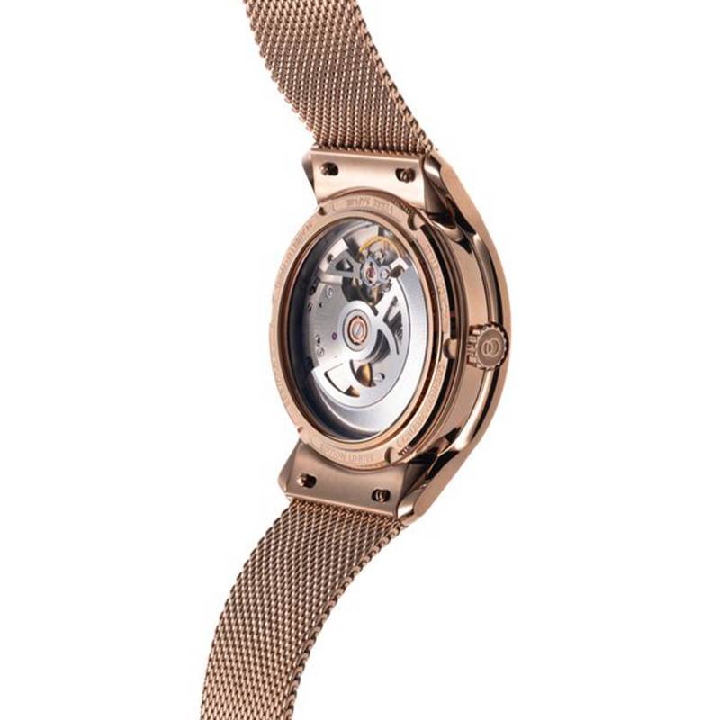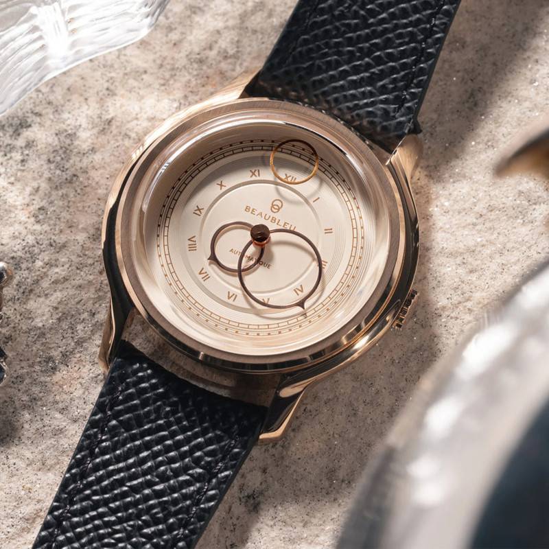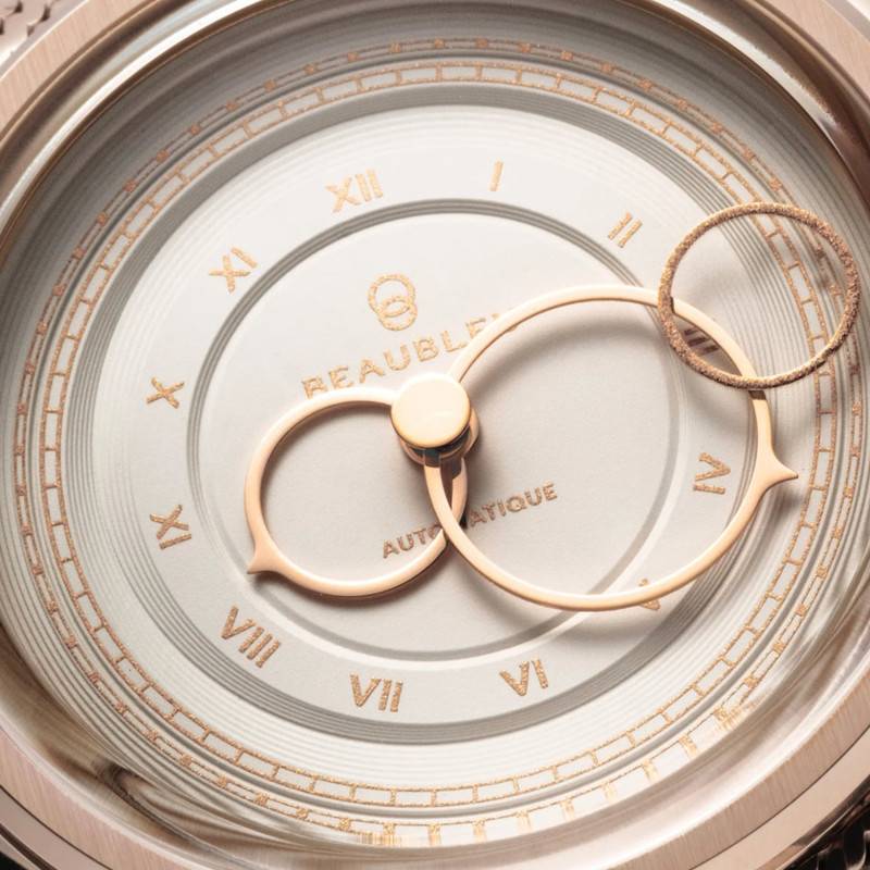 Le cadran est sans conteste le cœur battant de cette montre, avec son design en double cercle finement travaillé. Ornées d'index en chiffres romains dorés, les heures s'affichent avec une élégance classique qu'accentue la couleur champagne de l'ensemble. Ce cadran monobloc est une véritable œuvre d'art en soi, fabriqué en partenariat avec la Monnaie de Paris, où chaque détail a été pensé pour capter la lumière de manière subtile. Les aiguilles circulaires, avec une finition en or rose, ajoutent une touche de luxe supplémentaire. La conception de la trotteuse, dite "seconde volante", offre un mouvement fluide et aérien qui capte le regard à chaque instant. Chaque montre de cette édition est unique avec un numéro gravé au dos, un détail qui plaira aux collectionneurs appréciant les séries limitées de 888 exemplaires.