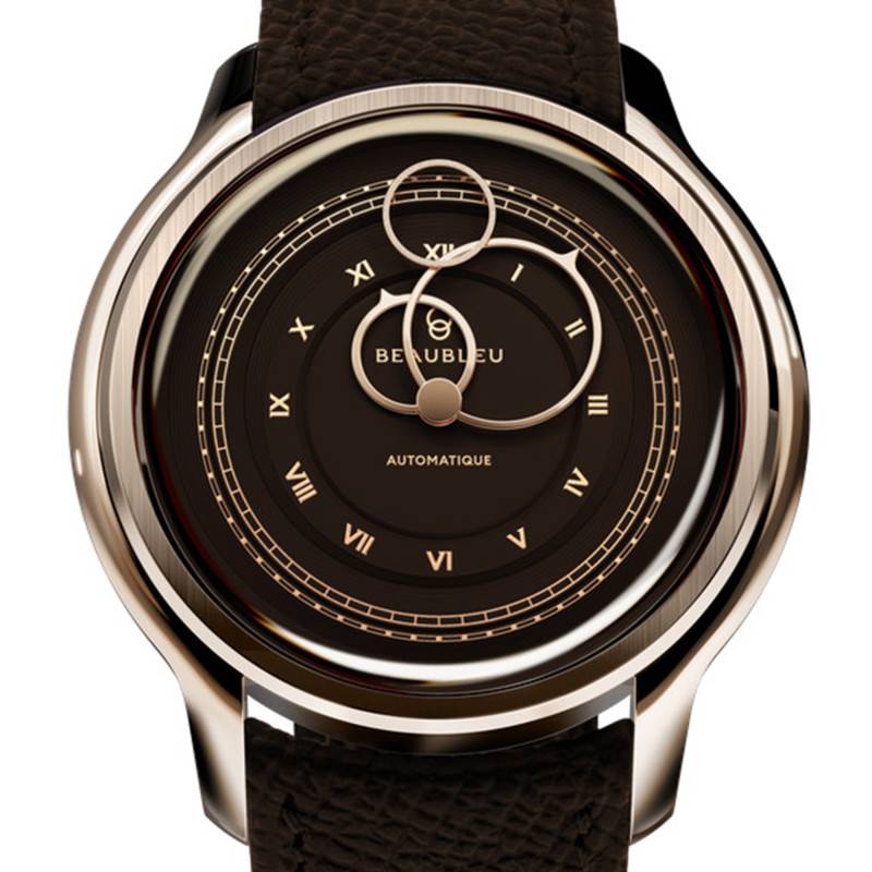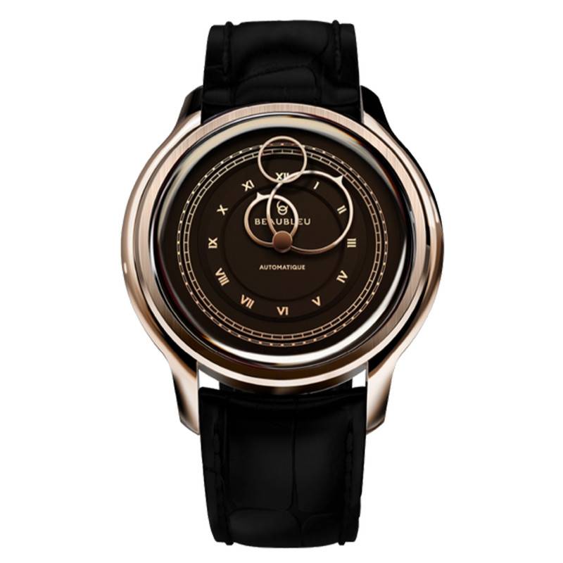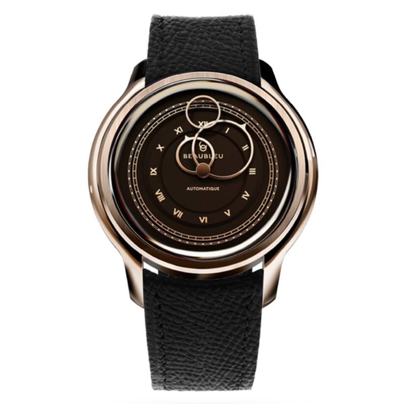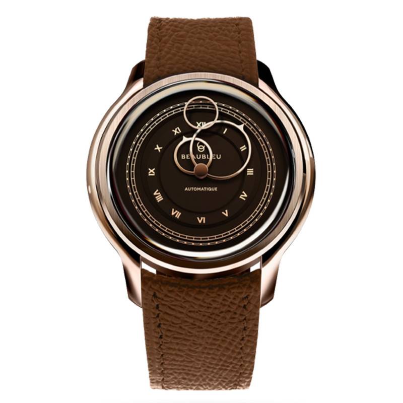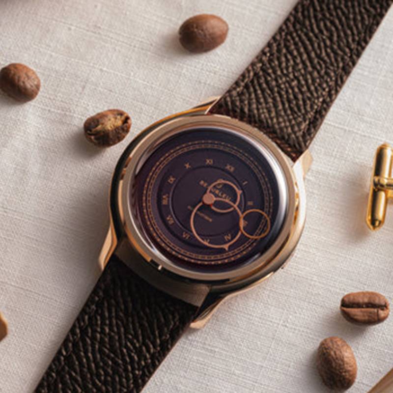 Le cadran est le véritable point d'orgue de la montre moka, incarnant un équilibre parfait entre sophistication et modernité. Ce cadran a été frappé à la Monnaie de Paris et sa finition en double cercle offre un jeu de profondeurs qui capte l'attention tandis que les chiffres romains dorés apportent une touche de classicisme. Le choix audacieux des aiguilles circulaires en or rose contraste harmonieusement avec la teinte dense du fond, conférant à ce garde-temps un look résolument avant-gardiste. L'innovation ne s'arrête pas là; la trotteuse volante évolue librement sur le cadran, lui insufflant un dynamisme presque magique. Le cadran monobloc accueille également des index dorés qui soulignent les heures avec précision tout en demeurant discrets.