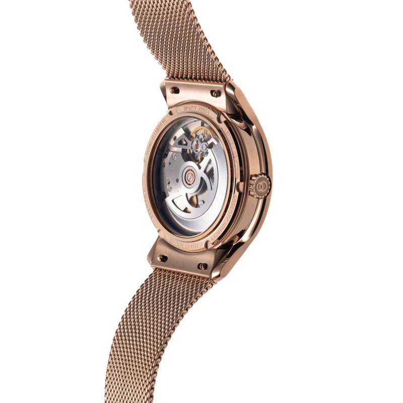 Cette montre se décline avec plusieurs types de bracelets afin de s'adapter à toutes les envies et à chaque style. Vous pouvez opter pour un bracelet en acier inoxydable avec finition or rose, équipé d'une boucle coulissante permettant un réglage simple et précis au poignet. Le modèle est également proposé avec des bracelets en cuir grainé, disponibles en marron, cognac ou noir, pour une allure élégante et intemporelle. Une version en cuir noir façon caïman est aussi disponible, offrant un style plus audacieux et sophistiqué. Les bracelets en cuir sont quant à eux munis d'une boucle ardillon, garantissant un maintien sûr et un confort optimal au quotidien. L'entrecorne de 20 mm garantit une stabilité et un ajustement parfait au poignet, transformant chaque porté en une expérience quotidienne satisfaisante.