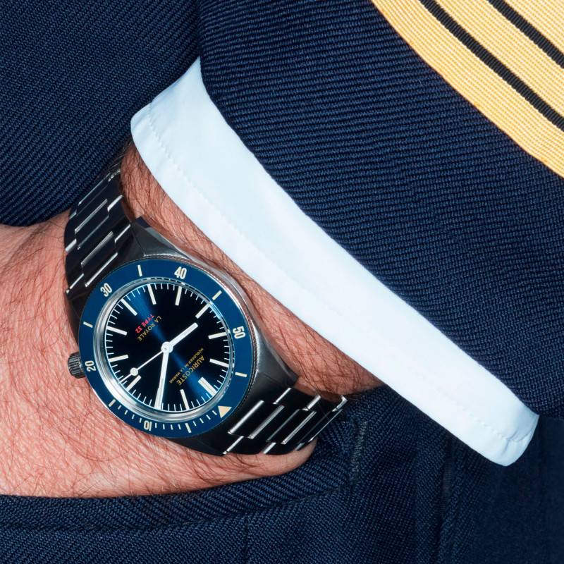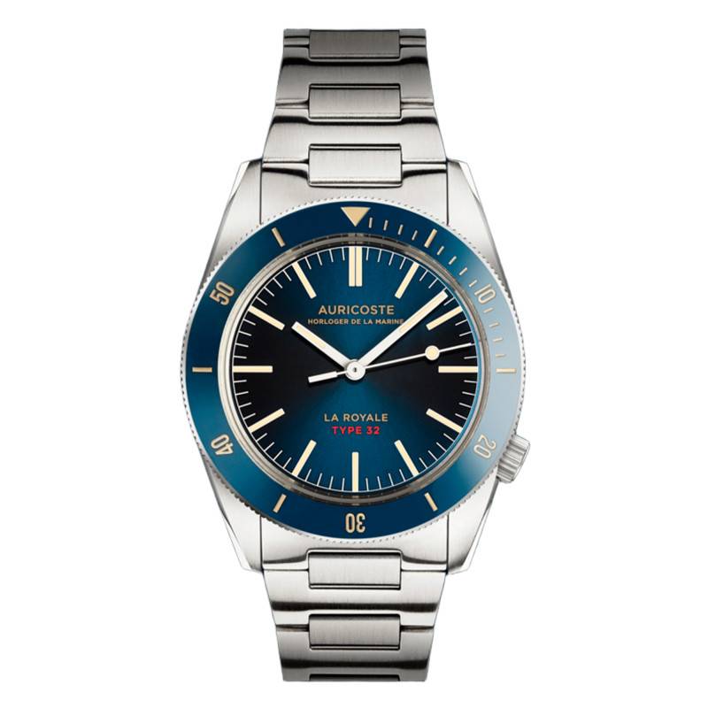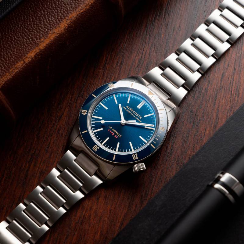 La montre La Royale Bleue de la marque Auricoste est une véritable incarnation de l'art horloger, élégamment inspirée par le patrimoine des montres de plongée militaires des années 60. Le boîtier, en acier inoxydable 316L, présente une forme tonneau optimisée pour un confort total au poignet grâce à un design ultraplat et subtil, surnommé 'L'Invisible®'. Mesurant 37 mm de diamètre pour une épaisseur de 11 mm, elle allie robustesse et élégance sous une apparente simplicité visuelle. Le boîtier est marqué par des lignes nettes et une combinaison sophistiquée de surfaces brossées et polies qui évoquent une certaine subtilité dynamique, tandis que le verre de qualité supérieure en saphir avec traitement antireflets procure une protection exceptionnelle, résistante aux rayures. Le fond du boîtier, transparent et vissé, offre une fenêtre sur le cœur mécanique de cette montre, renforçant son caractère captivant.