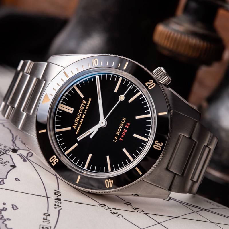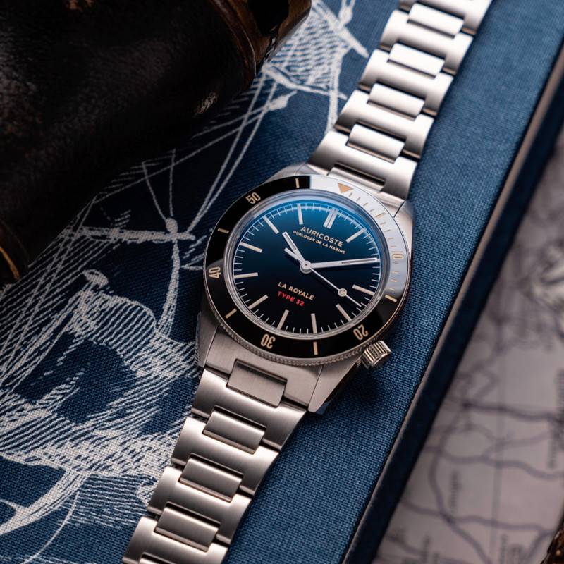 La montre Auricoste La Royale Type 32 Noire représente une fusion merveilleuse entre robustesse et élégance. Fabriqué en acier inoxydable 316L, ce garde-temps présente un boîtier tonneau aux dimensions soigneusement étudiées, avec un diamètre de 37 mm et une épaisseur de 11 mm. Ces éléments permettent à la montre de s'adapter parfaitement à n'importe quel poignet tout en garantissant un confort optimal au quotidien. Le verre saphir avec son traitement antireflets accroît la durabilité en offrant une résistance exceptionnelle aux rayures. Le fond de boîte vissé et transparent permet d'admirer la mécanique interne tandis que le design général allie un aspect brossé et poli pour une finition mate et brillante.