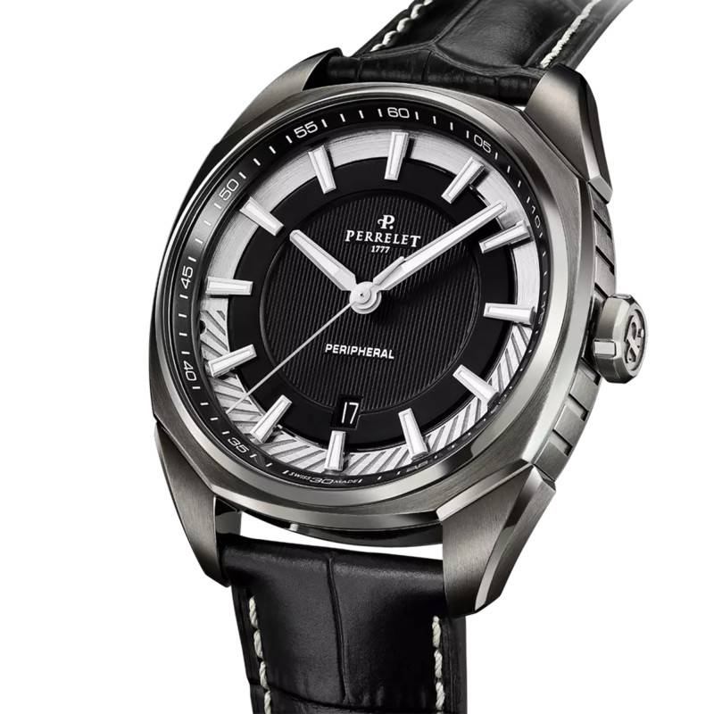 Perrelet est une marque considérée comme un pionnier et un pilier de la haute horlogerie. Elle a inventé la montre automatique et cherche en permanence à se développer et vous proposer des modèles, des collections avant-gardiste avec une maîtrise complète dans la confection de leurs produits avec des matériaux d'exceptions. Elle vous présente la collection Lab Peripheral de la gamme 3 aiguilles et date. Cette montre A1102/1 plaira beaucoup aux hommes avec son design chic et élégant et aussi avec ses dimensions qui sont de 42 mm de diamètre et de 13.51 mm d'épaisseur. Son boîtier "coussin" est en acier inoxydable et recouvert d'un PVD "gris rasoir". Pour protéger parfaitement le cadran, un verre saphir le surplombe. Sur la droite du boîtier, vous avez une couronne remontoir pour régler les aiguilles et le guichet date à votre convenance. Enfin, son fond de boîte est maintenu par des vis et vous pourrez admirer son mécanisme automatique grâce à son fond transparent. Et la montre dispose d'une étanchéité allant jusqu'à 5 atmosphères.