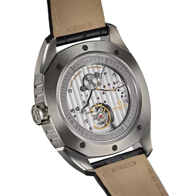 La maison Perrelet créé depuis 1977 des produits horlogers de haute qualité grâce à son savoir-faire et ses modèles d'exception. Aujourd'hui, la maison vous propose une montre au style masculin et élégant de la collection Lab Peripheral de la gamme 3 hands and date. Cette montre dispose d'un diamètre de 42mm et d'une épaisseur de 13.51mm. Ces dimensions sont idéales pour un poignet masculin. Son boîtier est en forme coussin et est fabriqué en acier inoxydable. Un verre saphir, connu pour sa très bonne résistance aux chocs et rayures, vient recouvrir son cadran. A droite de la montre, se trouve un bouton remontoir afin que vous puissiez régler comme bon vous semble les aiguilles des heures et des minutes ainsi que son guichet date. Ensuite, le fond de boîte de la montre est maintenu par des vis et vous pourrez admirer son mécanisme automatique grâce à son fond transparent. Enfin, la montre dispose d'une étanchéité allant jusqu'à 5 atmosphères.