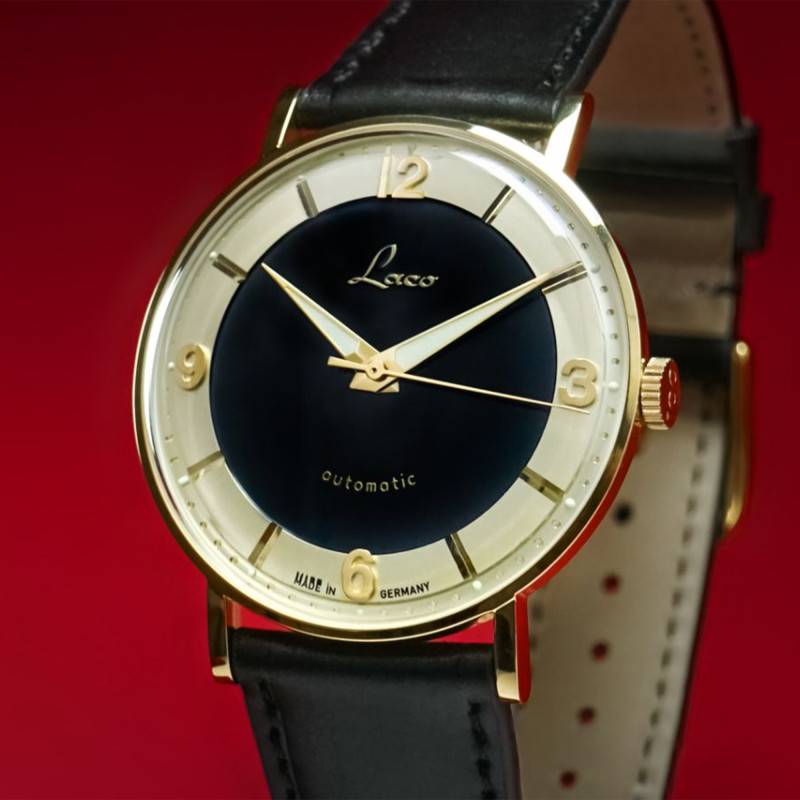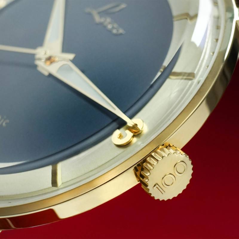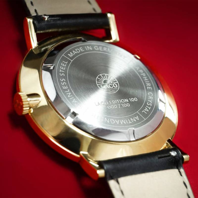 La Laco Edition 100 est une montre exceptionnelle qui rend hommage à un siècle de savoir-faire horloger. Conçue en Allemagne, cette montre allie l'élégance classique à une touche de modernité. Le boîtier, de forme ronde, est réalisé en acier inoxydable avec un superbe placage ionique de couleur or qui lui confère un éclat incomparable. Cette finition polie et brillante est non seulement visuellement attrayante mais aussi durable, assurant que la montre résiste aux rigueurs du quotidien. D'un poids de 49 g, elle offre un confort optimal, tandis que ses dimensions de 38 mm de diamètre et 9.8 mm d'épaisseur lui permettent de s'adapter à tous les poignets. Le verre saphir doublement bombé avec traitement antireflets assure une lisibilité parfaite dans toutes les conditions de lumière. Le fond du boîtier est vissé, garantissant une étanchéité de 5 ATM qui protège le mouvement sophistiqué. En tant qu'édition limitée à 100 exemplaires dans le monde, chaque montre est gravée avec son numéro unique au dos, accentuant son exclusivité et transformant chaque pièce en un véritable objet de collection. La couronne, ornée du relief "100", rappelle subtilement cet anniversaire mémorable.