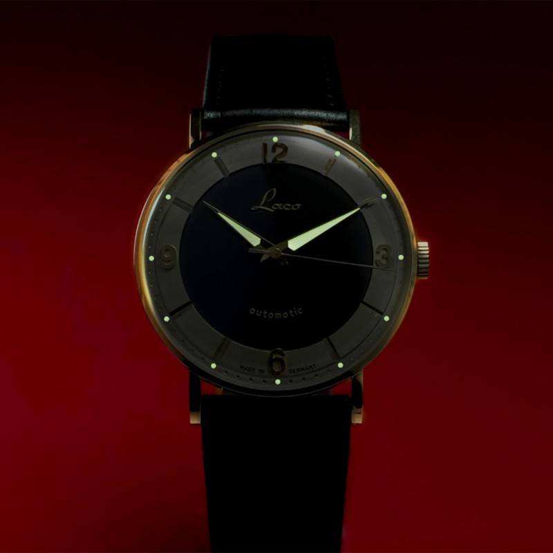 Le cadran de la Laco Edition 100 est un magnifique exemple de sophistication et de lisibilité. Sa finition mat en noir crée un contraste élégant avec les chiffres arabes et les index dorés qui entourent le chemin de fer des minutes. Le cadran est parfaitement équilibré et adopte un design classique facilitant la lecture des indications. Les aiguilles sont conçues pour être fonctionnelles et esthétiques, recouvertes d'un revêtement luminescent SuperLuminova C3, permettant une visibilité en toute circonstance, même dans l'obscurité. Cet affichage analogique arbore les heures, minutes, et secondes, offrant une indication précise du temps.