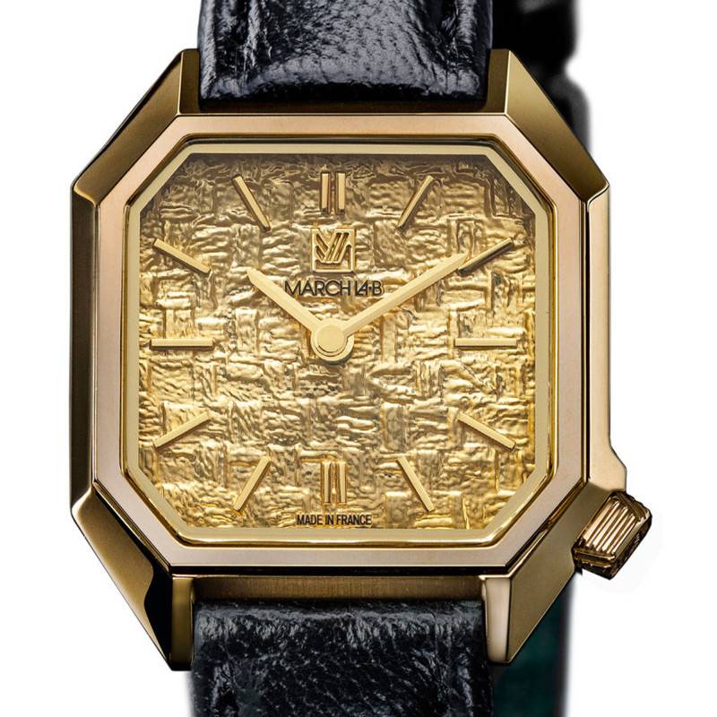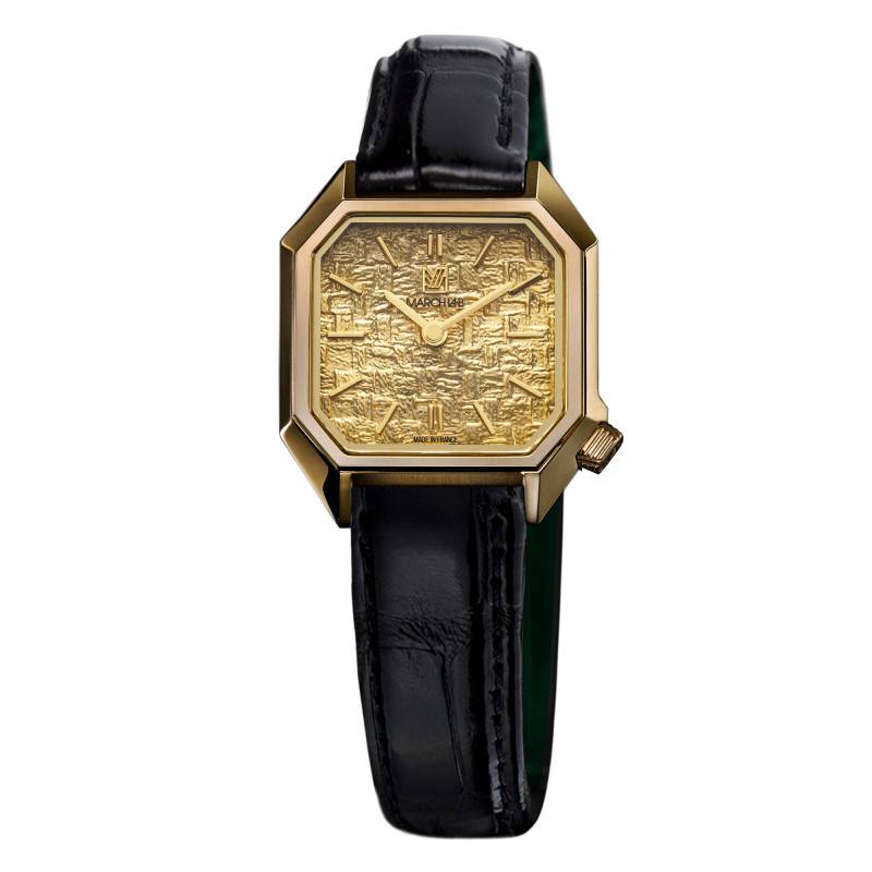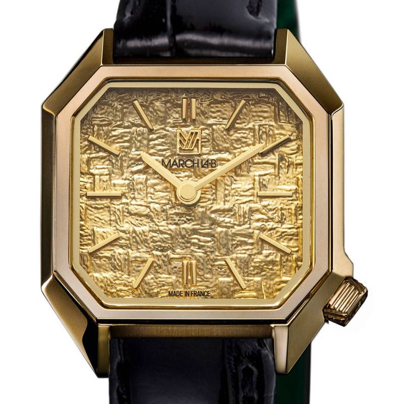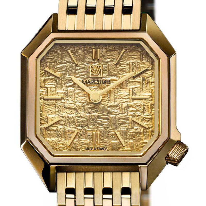 La montre Lady Mansart Electrique Tweed Gold de March LAB affiche une esthétique unique grâce à son boîtier octogonal minutieusement travaillé. Conçu en acier inoxydable 316L, ce boîtier est embelli par des finitions polies et satinées en PVD jaune, créant ainsi un jeu sophistiqué de textures et de couleurs. La montre, avec ses dimensions compactes de 26 mm de diamètre pour une épaisseur de 6,5 mm, est spécialement conçue pour épouser élégamment le poignet de la femme moderne. De fabrication française, chaque détail témoigne d'un savoir-faire artisanal impressionnant.