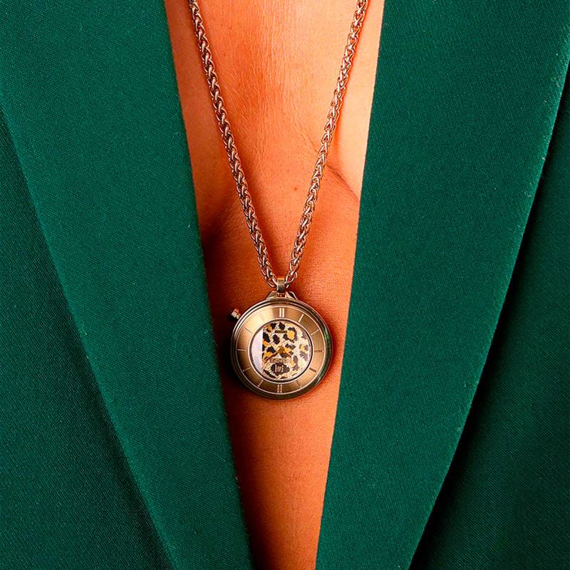 Transformant la montre en bijou, la Lady Volante Sautoir Cheetah se présente avec une chaîne délicate qui permet de la porter autour du cou. Réalisée en acier inoxydable avec un traitement PVD jaune, cette chaîne assure une solidité et une résistance à l'usure tout en offrant une touche luxueuse et actuelle. La longueur de la chaîne a été soigneusement étudiée pour permettre à la montre de se poser naturellement sur la poitrine, créant ainsi un effet visuel saisissant qui valorise la silhouette féminine.