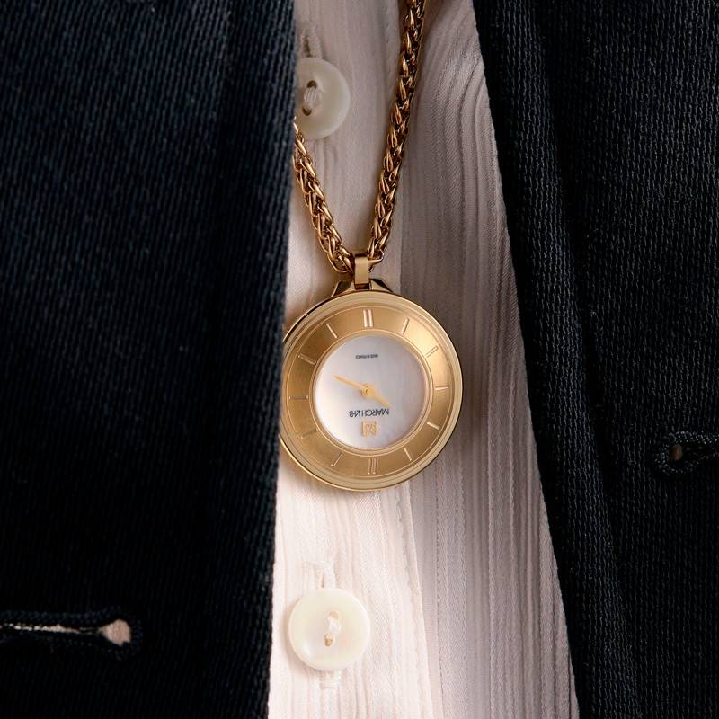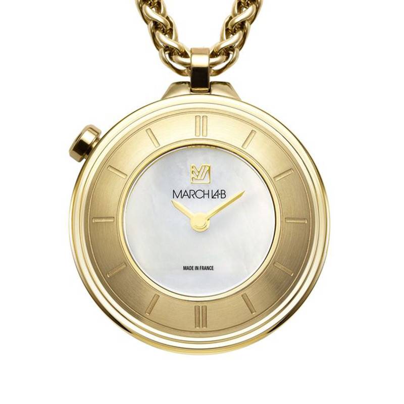 La montre Lady Volante Sautoir Nacre de March LAB est bien plus qu'un simple garde-temps, elle incarne une véritable pièce de joaillerie délicatement conçue pour les femmes modernes. Le boîtier rond en acier inoxydable de haute qualité, finement travaillé, présente un diamètre de 30 mm et une épaisseur de 10 mm. Sa finition mate brossée et polie alliée à un revêtement PVD jaune confère un aspect luxueux et raffiné à l'ensemble. Le concept de cette montre suspendue à une chaîne illustre parfaitement la volonté de March LAB de redéfinir le geste de lire l'heure, transformant cet objet du quotidien en une véritable pièce d'horlogerie à porter autour du cou.