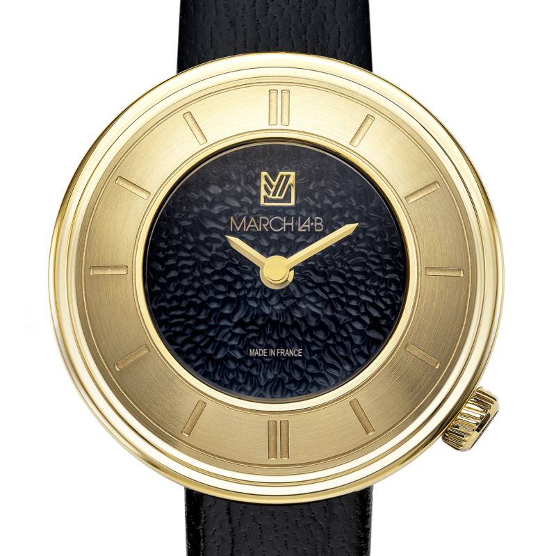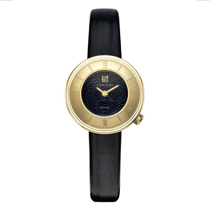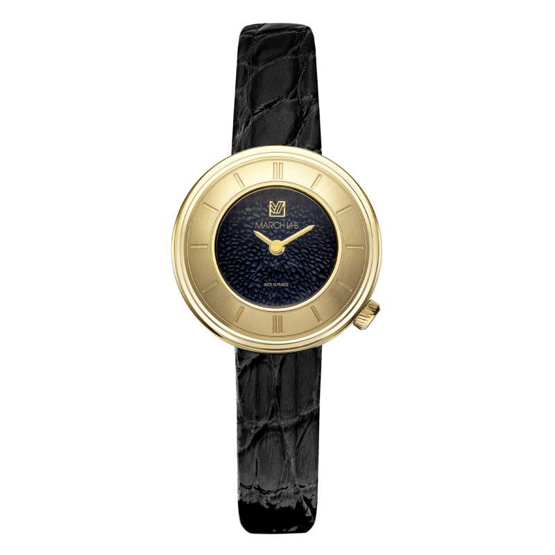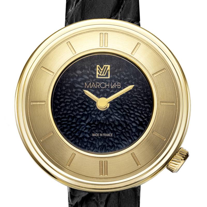 La Montre Lady Volante Supreme de March LAB s'inscrit dans une tradition horlogère française de haute qualité. Avec un boîtier rond en acier inoxydable recouvert d'un luxueux traitement PVD or jaune, cette montre incarne la sophistication avec une touche rétro. Elle est inspirée par l'esprit des années 1970, époque de la culture disco qui a fortement influencé le design et la mode. Le boîtier a un diamètre de 30,00 mm et une épaisseur fine de 10,00 mm, permettant un port discret et confortable au poignet. La montre est équipée d'une lunette fixe avec un chemin de fer des minutes, renforçant la précision de la lecture du temps. Une couronne discrète ajoute à l'esthétique globale sans compromettre l'élégance de la pièce. La montre est également conçue pour offrir une résistance suffisante à l'eau, avec une étanchéité de 5 ATM.