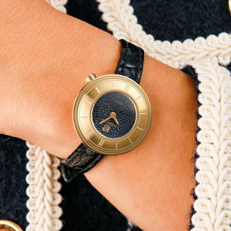Le bracelet de la montre Lady Volante Supreme est une déclaration de style en soi. Disponible au choix en cuir d'alligator ou en cuir de chevreau via le menu déroulant. Les couleurs noires et les finitions soigneusement travaillées donnent à la montre une allure sophistiquée qui complète parfaitement le boîtier en or jaune PVD. Le fermoir à boucle ardillon offre sécurité et facilité d'utilisation, tout en ajoutant une autre touche de doré qui résonne avec les autres éléments de la montre. L'entrecorne de 14,00 mm est dimensionnée pour assurer un ajustement parfait et confortable sur le poignet.