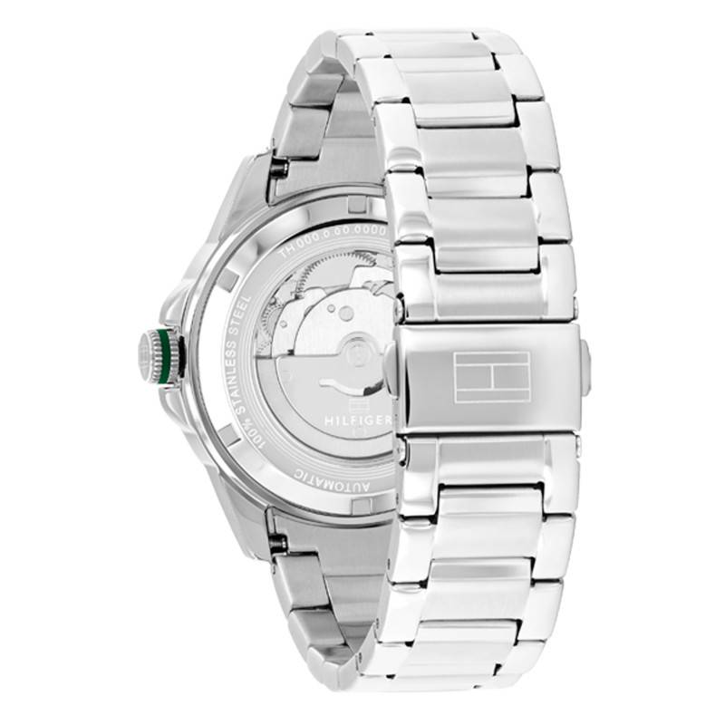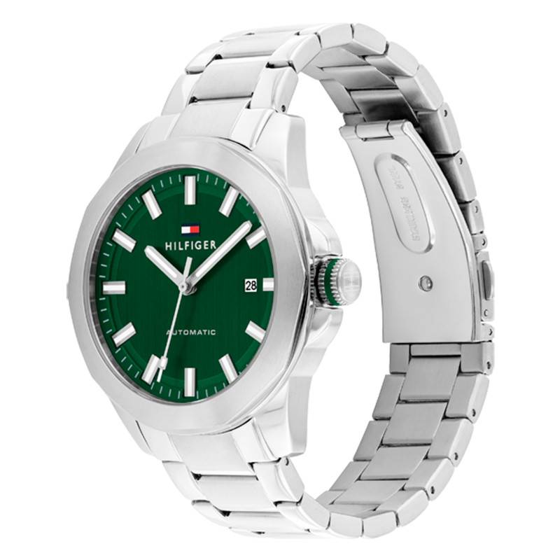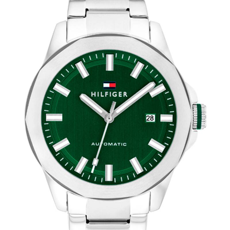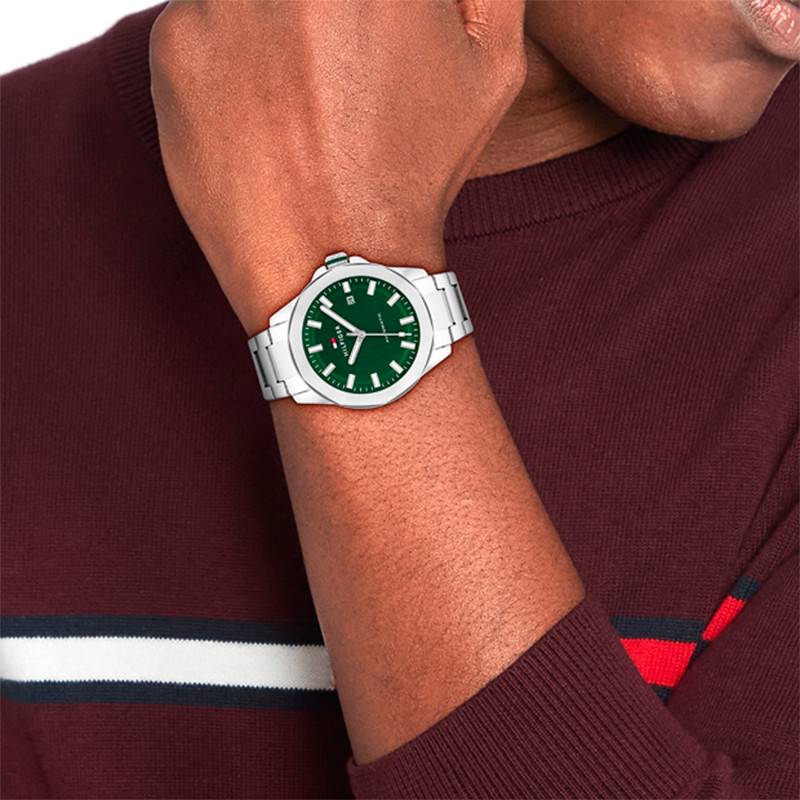 Le modèle Tommy Hilfiger se distingue par son boîtier rond en acier inoxydable, mesurant 42 mm de diamètre pour une épaisseur de 12 mm. Sa surface lisse et résistante à l'usure assure à la fois robustesse et élégance. Le verre minéral protège efficacement le cadran vert, tout en offrant une visibilité claire des aiguilles et des indicateurs de temps. Ce garde-temps est aussi élaboré avec un fond vissé, garantissant une étanchéité jusqu'à 5 ATM. Sa structure solide et son poids agréable de 130 g en font un choix parfait pour un usage quotidien.