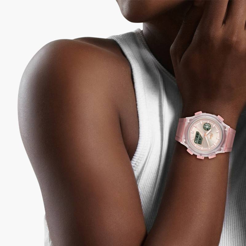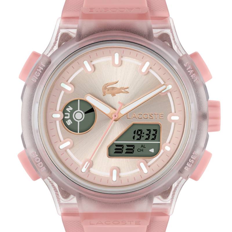 Le cadran de la montre Lacoste Lc33, paré d'une teinte rose délicate et d'une finition soleillée, capte la lumière de manière subtile, créant des reflets élégants qui rehaussent son esthétique. Les aiguilles luminescentes en harmonie avec les index apportent une visibilité optimale même dans l'obscurité grâce à l'éclairage nocturne assuré par un système de rétroéclairage. Les indications de temps, comprenant les heures, les minutes, les secondes, ainsi que le calendrier complet avec le jour, la date, le mois, sont judicieusement intégrées pour une lecture facile et rapide. En plus de l'affichage analogique, un écran LCD digital offre une chronographie précise et une multitude de fonctionnalités additionnelles comme l'alarme et une variété d'options liées au chronométrage.