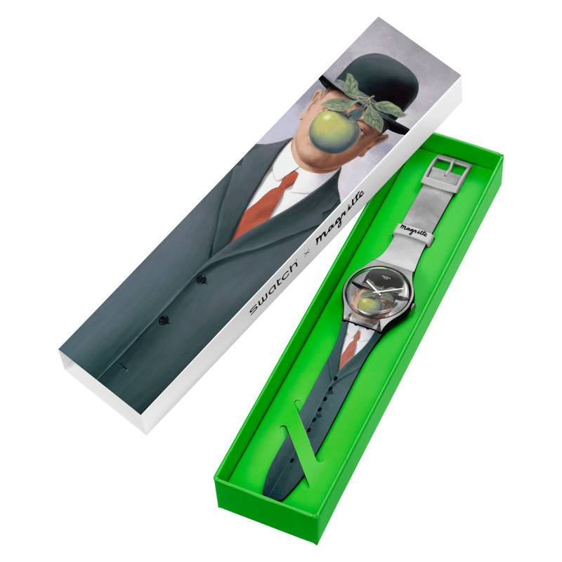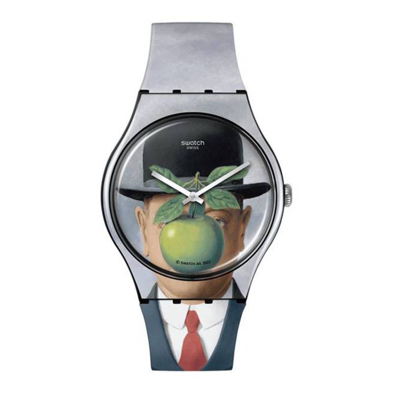 Le groupe Swatch est un acteur incontournable du monde de l'horlogerie qui atteint le statut d'icône grâce à ses créations. La marque propose des montres fines, innovantes et diversifiées qui s'inscrivent dans une mouvance artistique. Suivant son ADN, elle présente la montre Le Fils de L'homme qui est un modèle portant l'œuvre de René Magritte. Elle est composée d'un boîtier en plastique qui mesure 41 mm de diamètre, 9,85 mm d'épaisseur et 47,40 de hauteur. Il est habillé d'une jolie couleur grise qui rejoint celle du tableau artistique dont la montre est inspirée. Une couronne aplatie se place à 3 heures pour assurer le réglage des heures et des minutes. Pour ce qui est du fond, il est monobloc et comporte une ouverture vissée qui permet de changer facilement la pile. Ce fond permet une étanchéité de 3 ATM.