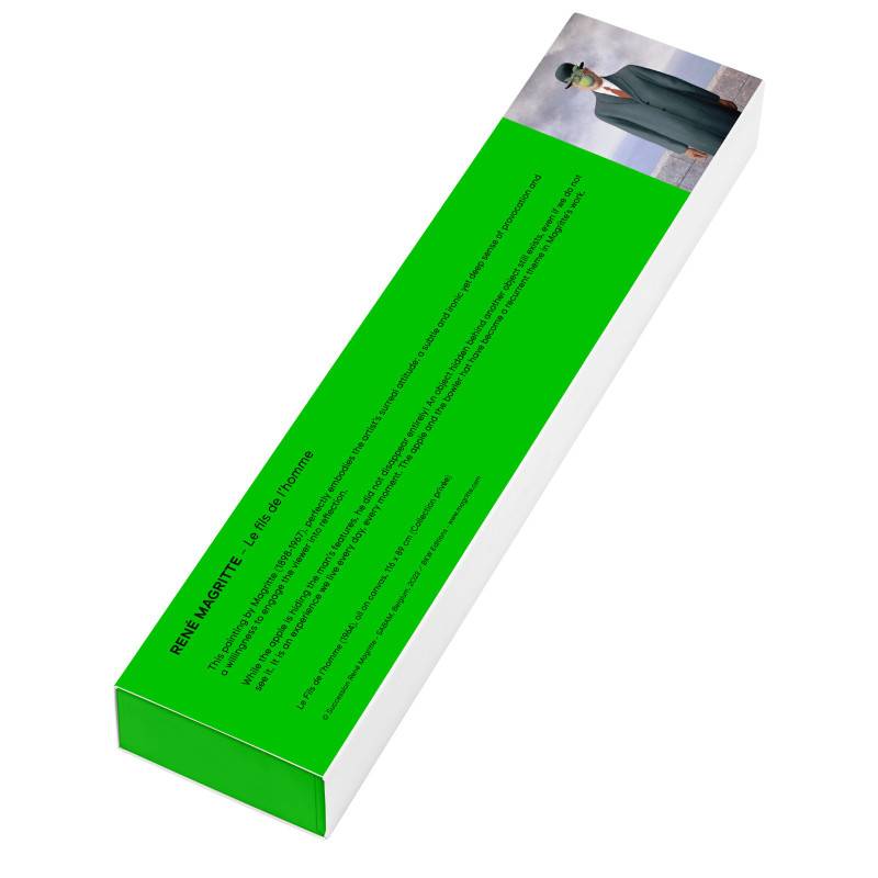 Comme le cadran, le bracelet de cette montre comporte la deuxième partie du tableau de René Magritte. Il se pare d'une continuité de la peinture illustrée sur le cadran et présente la silhouette du personnage. Vous trouverez sur sa face interne la phrase « Ceci est une Swatch avec une pomme » et sur son passant le nom du peintre. De couleur grise et conçu en silicone, il se termine par une boucle ardillon.