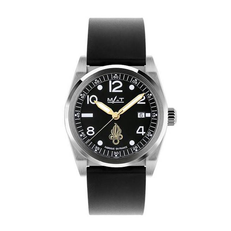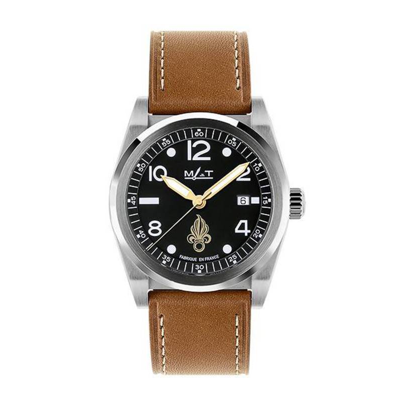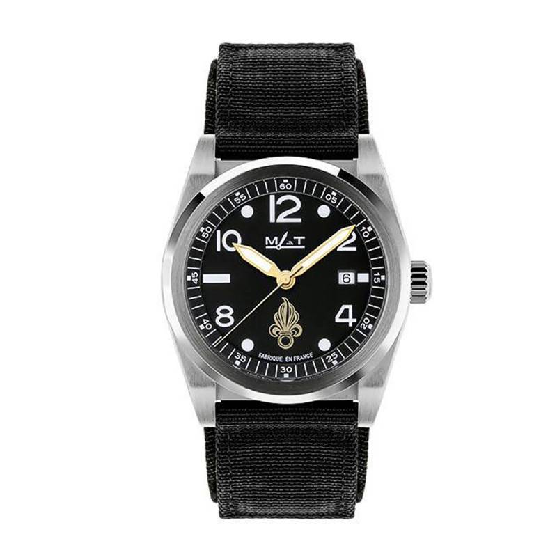 Connue pour son savoir-faire horloger prenant empreinte sur les racines militaires, la maison Matwatches vous dévoile un cadran aux courbes arrondies d'une intense couleur noire. Au coeur du cadran sont situées deux aiguilles et une trotteuse jaunes qui parcourent le cadran pour vous délivrer respectivement les heures, les minutes et les secondes avec précision. Cette lecture est accompagnée d'index en chiffres arabes pour les heures paires. Ces marqueurs temporels sont revêtus d'un traitement luminescent SuperLuminova BGW9 qui vous permettra de lire l'heure lors de vos missions nocturnes. Pour accompagner la précision du modèle, vous retrouverez un chemin de fer sur le pourtour du cadran, doté de chiffres arabes toutes les cinq minutes. Repérez-vous au quotidien grâce au guichet date logé à 3 heures. Enfin, la maison signe son garde-temps sous l'index de midi et rappelle son origine à 6 heures par la mention "Fabrique en France".