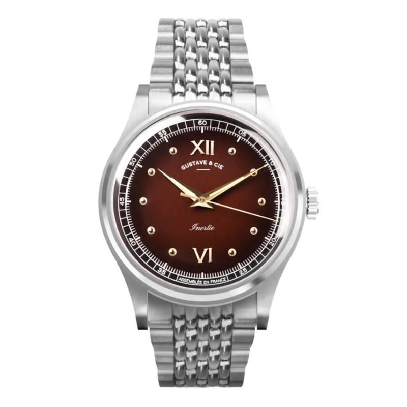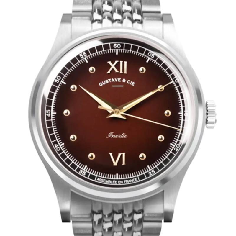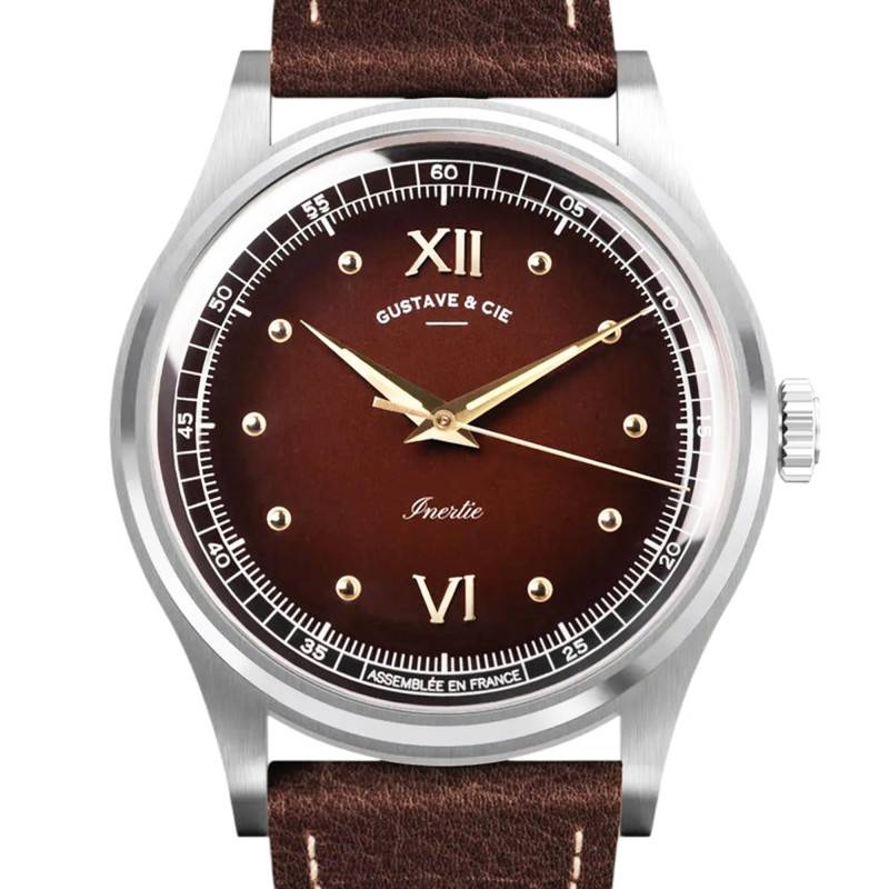 Le cadran est une œuvre de contraste et de sophistication. Arborant une teinte marron laquée, il brille avec excellence grâce à sa finition polie. Le cadran joue sur les nuances, variant d'intensité selon l'angle d'incidence de la lumière, comme un hommage silencieux à la mécanique subtile du pendule de Foucault. Les index en demi-sphère évoquent le mouvement du temps, tandis que les aiguilles dauphine, ornées de Super-Luminova, promettent une lisibilité parfaite en toute condition. Les chiffres romains à 12 et 6 heures, associés à un chemin de fer délicat, confèrent une dimension classique et élégante à l'ensemble. Le mot « Inertie » à 6 heures rend hommage au délicat équilibre entre science et élégance qui caractérise cette montre.