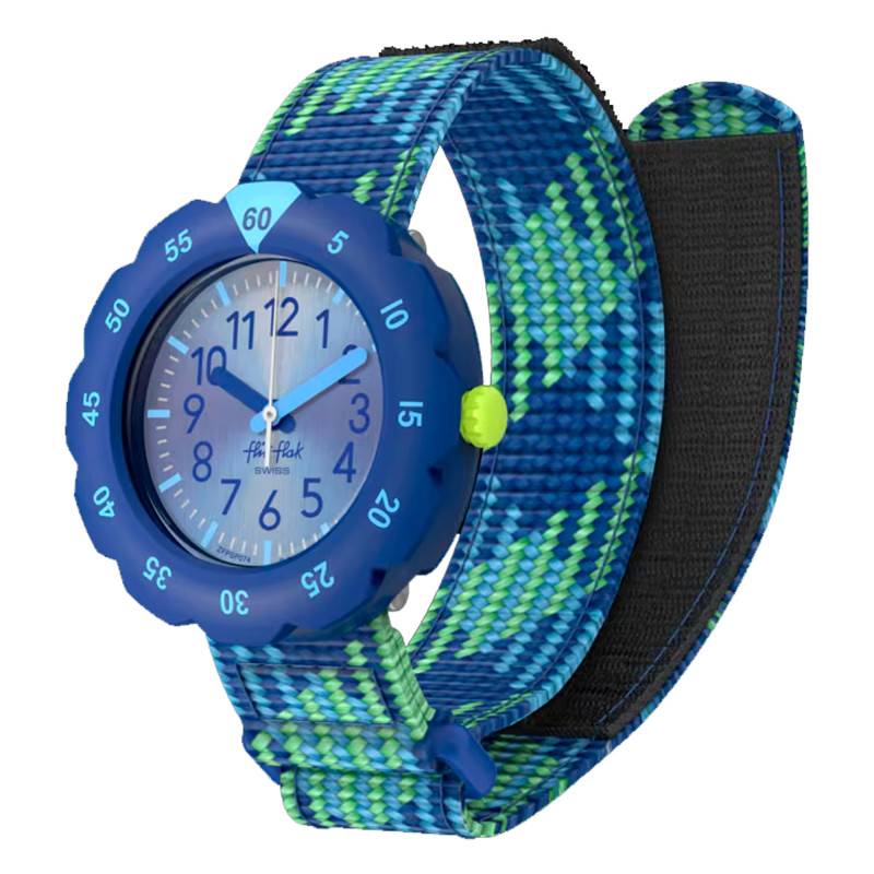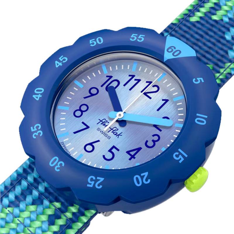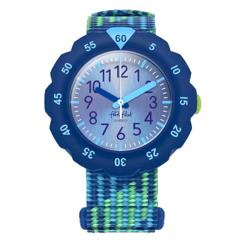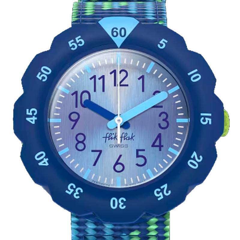Flik Flak est une marque suisse qui s'intéresse à l'éducation des enfants. Elle allie savoir-faire et innovation pour fabriquer des montres pédagogiques pour les enfants. Elle devient un choix évident pour tous les parents désireux de voir leurs enfants lire l'heure correctement en s'amusant. À cet effet, la marque vous propose la montre Loop In Blue FPSP074. Elle dispose d'un boîtier conçu en plastique biosourcé de forme ronde et de couleur bleue. Mesurant 31,85 mm de diamètre, 10,19 mm d'épaisseur et 30,60 mm de longueur, il est doté d'une lunette fixe bleue sur laquelle sont marqués des chiffres arabes qui faciliteront la lecture temporelle. Le cadran est recouvert d'un verre plat et la couronne crantée positionnée à 3 heures assure un réglage précis des aiguilles. Pour finir, le fond de boîte monobloc assure une étanchéité de 3 ATM.