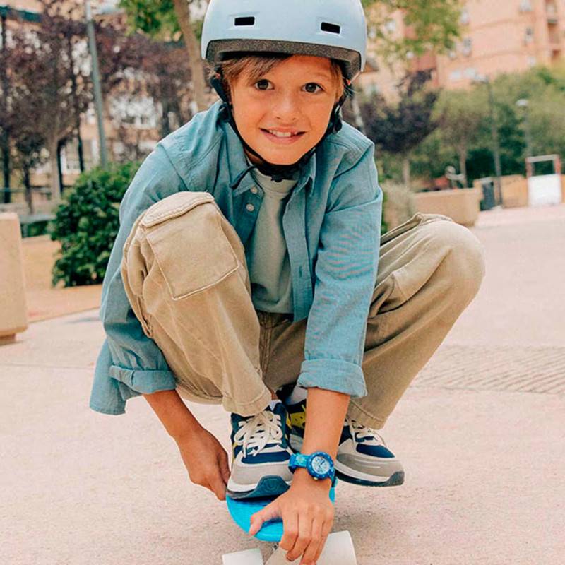 Arborant des finitions brossée et soleillée, ce cadran garantira une lecture optimale à votre enfant. De couleur bleue, il est marqué sur la bordure par un chemin de fer des minutes qui entoure des index en chiffres arabes pour les heures. Ces marqueurs de temps seront pointés par les trois aiguilles centrales qui indiquent les heures, les minutes et les secondes. Enfin, le nom de la marque est affiché à 6 heures en guise de signature.