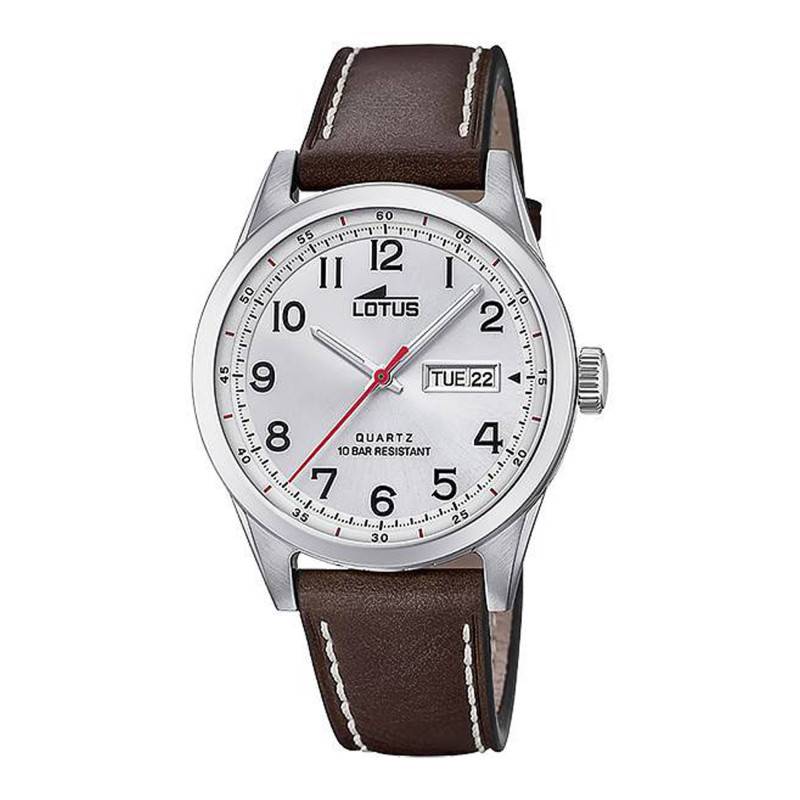 Créée en 1980, la marque Lotus imagine des montres au design contemporain, urbain et branché, disponibles à un prix accessible ! La montre quartz Lotus Homme 18671/1 se veut épurée avec un boîtier entièrement gris argenté et un bracelet en cuir marron. Le boîtier mesure 42 millimètres de diamètre et est de forme ronde. Conçu en acier inoxydable brossé, il est solide et résistant. Il dévoile à 3h une couronne crantée et de taille moyenne afin de régler facilement les heures, les minutes, les secondes ainsi que le guichet grande date (date et jour). La lunette se présente dans un style minimaliste, fixe et lisse, ce qui fait porter l'attention sur le design du cadran protégé par un verre minéral.