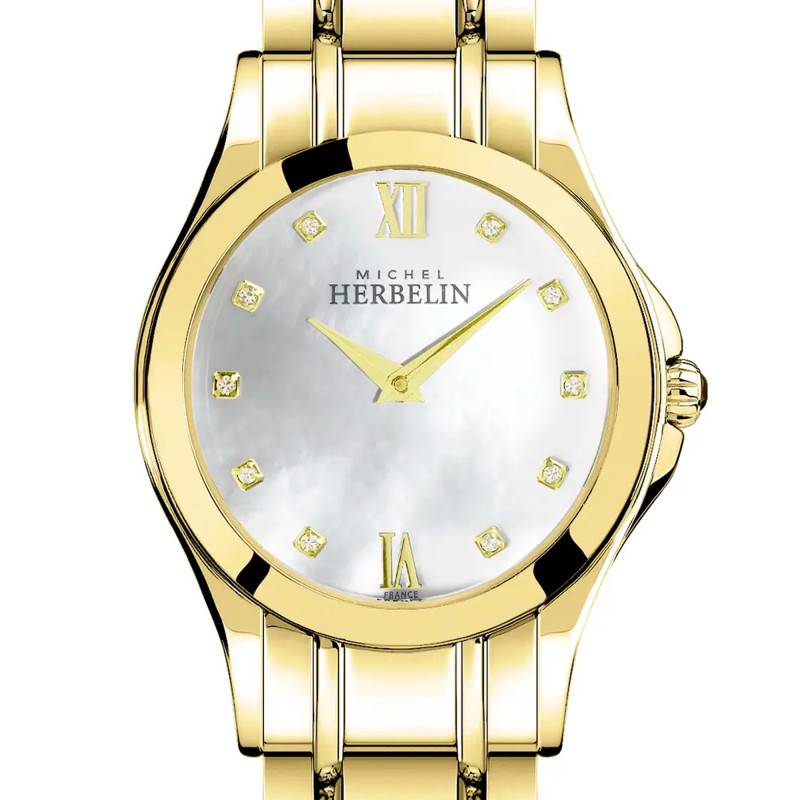 Herbelin est une marque française reconnue pour ses montres alliant tradition horlogère et innovation moderne. Depuis sa création, elle incarne l'élégance intemporelle et le savoir-faire exceptionnel de l'horlogerie française. La marque vous présente cette montre Luna 17487/BP59 issue de la collection Luna. Ce garde-temps pour femmes, au design raffiné, présente un boîtier rond de 29 mm de diamètre. Ce dernier est fabriqué en acier inoxydable 316L poli avec un revêtement PVD doré qui ajoute une touche élégante et moderne. Un verre saphir protège le cadran contre les rayures tandis que la couronne dorée permet le réglage des aiguilles. Le fond emboîté assure une étanchéité de 5 ATM.