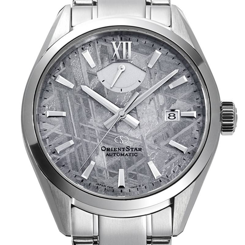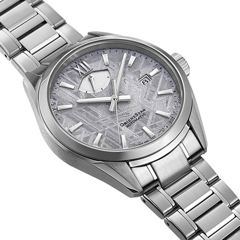 Le cadran de cette montre Orient Star est tout simplement captivant. Sa finition en météorite est un clin d'œil à l'astronomie, offrant une texture unique qui attire instantanément le regard. De somptueux chiffres romains et des index complètent la face de cette montre, apportant une touche de classicisme qui contraste élégamment avec la modernité du matériau utilisé. La disposition des éléments sur le cadran est claire et intuitive, facilitée par la présence d'un chemin de fer des minutes qui accentue la précision de la lecture de l'heure. Un guichet facilite l'affichage de la date, placé judicieusement à 3 heures pour une interaction naturelle.