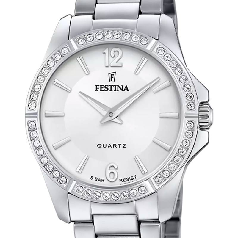 Mélange parfait entre élégance et harmonie, les montres de la maison Festina proposent des designs distingués et sont de haute qualité. Ici, nous vous proposons un modèle raffiné et simple qui vous accompagnera pour toutes les occasions: la montre Mademoiselle F20593/1. Equipée d'un boîtier de 34,5 millimètres de diamètres, ce dernier est fait en acier. Pour son épaisseur, sachez qu'elle correspond à 9,25 millimètres. Ainsi, les dimensions de ce garde-temps élégant seront parfaites pour les poignets féminins. Vous constaterez la superbe lunette remplie de strass qui apporte le côté unique et original à ce bijou horloger. Cette lunette se pose sur le verre minéral qui protège le cadran. A trois heures, un bouton remontoir vous simplifiera le réglage du temps. Enfin, cette montre possède une étanchéité qui s'élève à 5 ATM.