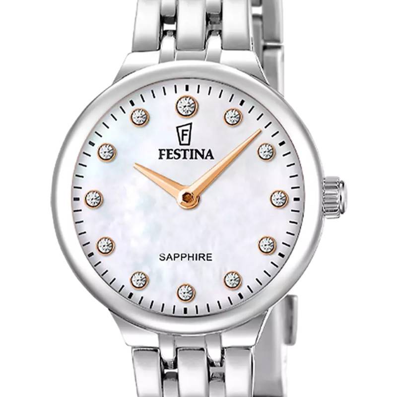 Le bracelet de la montre Festina Mademoiselle est aussi raffiné que fonctionnel. Réalisé en acier inoxydable gris, il reprend la même finition polie que le boîtier, assurant une continuité et une harmonie parfaite du design. Ce bracelet mesure 12 mm de largeur, assurant un ajustement confortable et sécurisé grâce à sa boucle déployante.