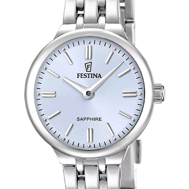Le cadran de la montre Festina Mademoiselle est un véritable atout de charme grâce à sa finition soleillée en bleu ciel éclatant. Cette finition permet d'offrir un jeu de lumière chatoyant qui attire irrésistiblement l'œil. Les éléments d'affichage sont marqués par des index élégants accompagnés d'un chemin de fer subtil, offrant une lisibilité parfaite tout en ajoutant une touche de raffinement. Le verre saphir protège ce magnifique cadran avec efficacité, garantissant ainsi une durabilité accrue à cette pièce d'horlogerie.