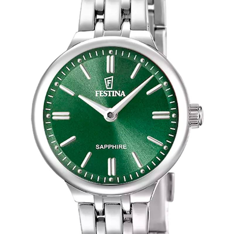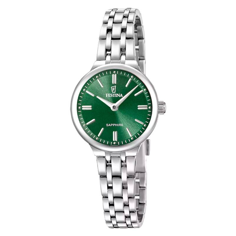 Le cadran vert de la montre Festina Mademoiselle rayonne avec une finition soleillée, une véritable prouesse esthétique qui rehausse chaque nuance de vert au gré des éclairages. Les index appliqués et le chemin de fer dessiné avec soin offrent une lisibilité optimale et soulignent l'attention méticuleuse apportée à chaque détail. Ce cadran concentre le temps avec la précision des aiguilles en affichage analogique, dédiées aux heures et minutes, ces dernières dansant sur la surface scintillante pour offrir un spectacle horloger en mouvement perpétuel.