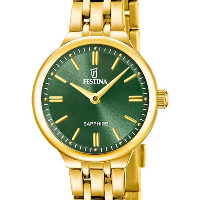Le cadran de la montre Festina Mademoiselle vous séduira par sa teinte verte avec une finition soleillée, créant de magnifiques jeux de lumière qui captivent le regard. Le verre saphir protège efficacement le cadran des rayures, garantissant ainsi une clarté incomparable. L'affichage est analogique, utilisant des aiguilles fines et précises accompagnées d'index pour une lisibilité optimale. Le chemin de fer des minutes encadre le tout avec raffinement, assurant une lecture du temps à la fois précise et esthétique. Le logo Festina est élégamment positionné à 12 heures, apportant une touche de signature discrète et affirmée.