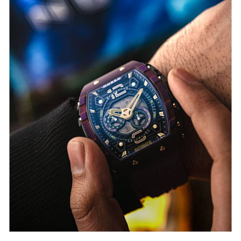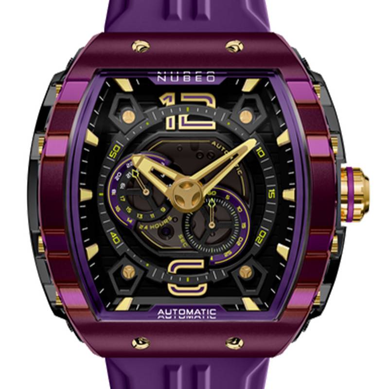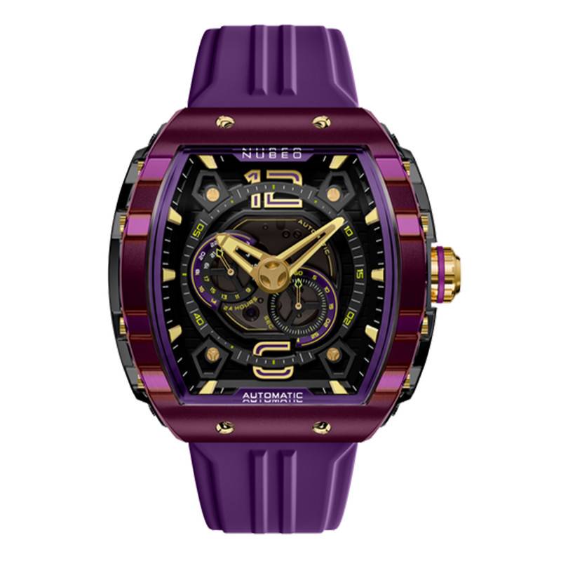 Complétant la structure robuste de la montre, le bracelet en silicone violet apporte une finition moderne et confortable. Sa légèreté et sa flexibilité offrent un confort inégalé, permettant une intégration parfaite au poignet, idéale pour un usage quotidien ou des occasions spéciales. La largeur de 26 mm à l'entrecorne garantit un maintien sûr et résistant, épousant merveilleusement bien la forme du boîtier. L'attache à boucle ardillon permet une fermeture simple et sécurisée, assurant que la montre reste bien positionnée au poignet, tandis que la couleur vibrante du bracelet rehausse l'esthétique globale de cette pièce d'horlogerie audacieuse.