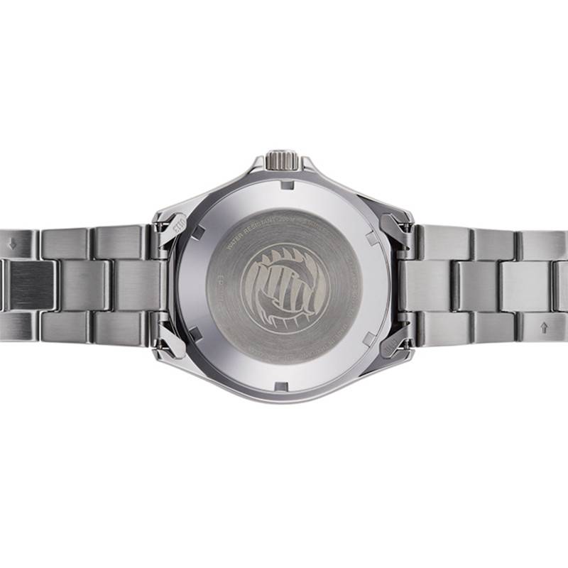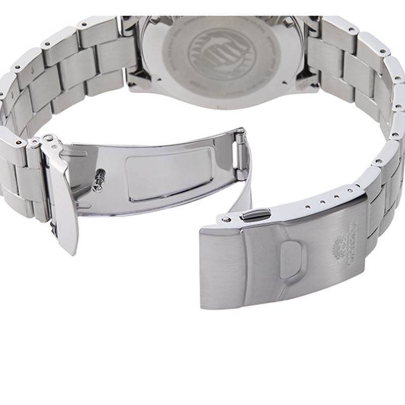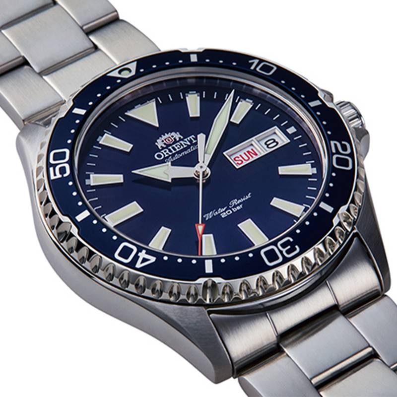 Fabriquant des montres de caractères très travaillées avec une fiabilité irréprochable, la marque horlogère japonaise Orient s'adresse à tous les amateurs de belle horlogerie. Avec sa gamme très complète, la marque touche une clientèle très large. Le modèle présenté ici s'adresse à tous les passionnés de plongée. Conçue avec un boîtier en acier inoxydable de 41,8mm de diamètre pour 13mm d'épaisseur, c'est un format plutôt robuste qui se destine aux poignets masculins. Il est surmonté par un verre saphir qui garantira la meilleure protection possible contre les chocs ou les rayures du fait de son extrême dureté. Une lunette rotative unidirectionnelle bleue graduée en chiffres arabes vient entourer habilement l'ensemble afin de pouvoir mesurer vos diverses expéditions. Une couronne-remontoir se localise à 3h sur le boitier, elle vous donnera la possibilité de modifier l'heure ou la date ou encore de remonter manuellement le mouvement lorsque c'est nécessaire. Précisons pour finir que le fond de boîtier est vissé, assurant une excellente étanchéité de 20 atmosphères.