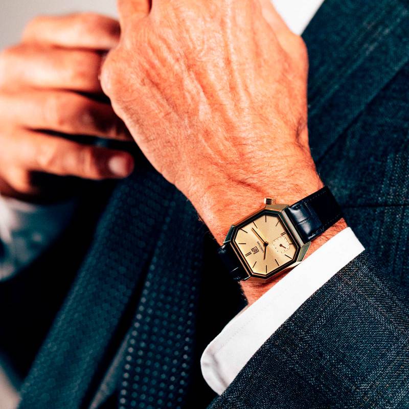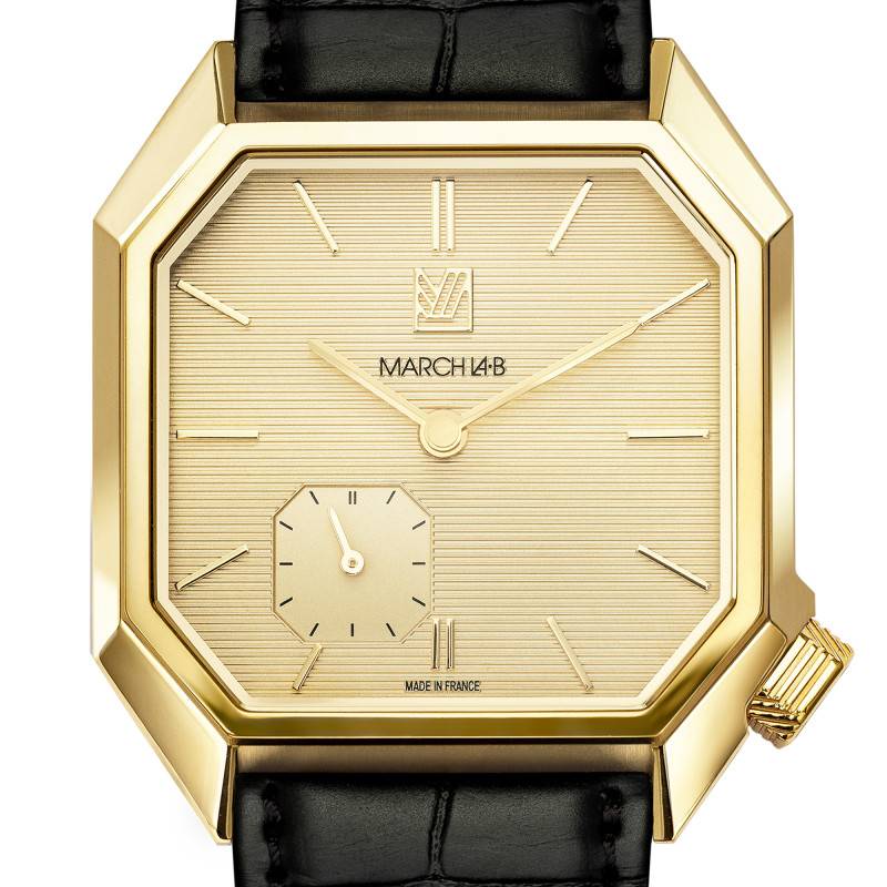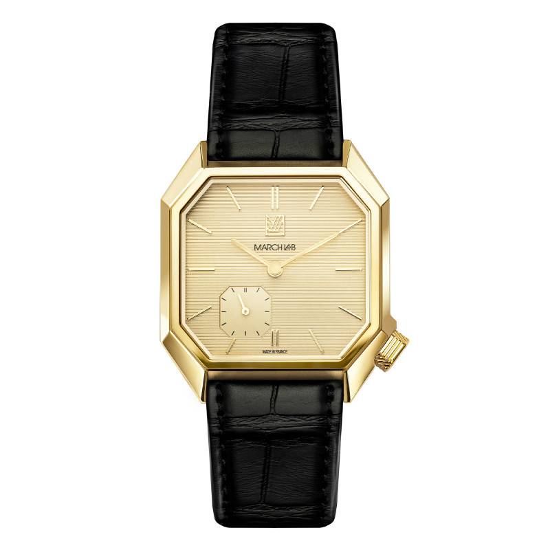 La Mansart Automatique Petite Seconde Golden Hour de March LAB fait une entrée remarquée avec son boîtier octogonal en acier plaqué or de 3 microns, donnant un aspect luxueux et raffiné. Cette montre pour homme s'inscrit dans la pure tradition horlogère française avec une fabrication méticuleuse de qualité. Avec ses dimensions de 39 mm de longueur et 35 mm de largeur, elle s'adapte parfaitement à tous les poignets. L'épaisseur de 11 mm offre quant à elle un profil élégant qui glisse facilement sous une manche de chemise. Conçue pour défier le temps et les éléments, cette montre présente un fond vissé garantissant une grande étanchéité et une durabilité accrue.