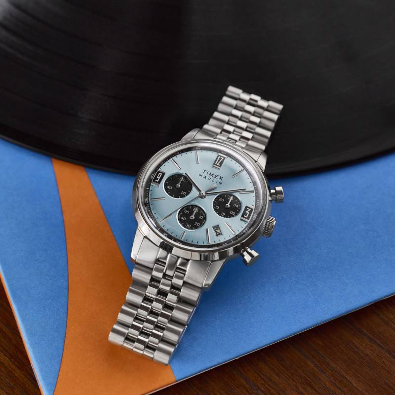 Le cadran de la Timex Marlin Chronograph est une œuvre d'art à lui seul. Arborant un magnifique fond bleu soleillé, il capte la lumière avec un éclat subtil et distingué. Chaque élément est pensé pour offrir une lisibilité optimale : les index et le chemin de fer des minutes accompagnent des chiffres arabes pour une lecture claire et intuitive. Grâce à trois compteurs additionnels, le chronographe assure une fonctionnalité élargie avec affichage 24 heures, 60 minutes et petite seconde. Un guichet de date, discrètement positionné, s'intègre harmonieusement dans l'ensemble. Les aiguilles sont précises et dynamiques, dictant le rythme avec assurance pour présenter heures, minutes et secondes dans une symphonie visuelle.