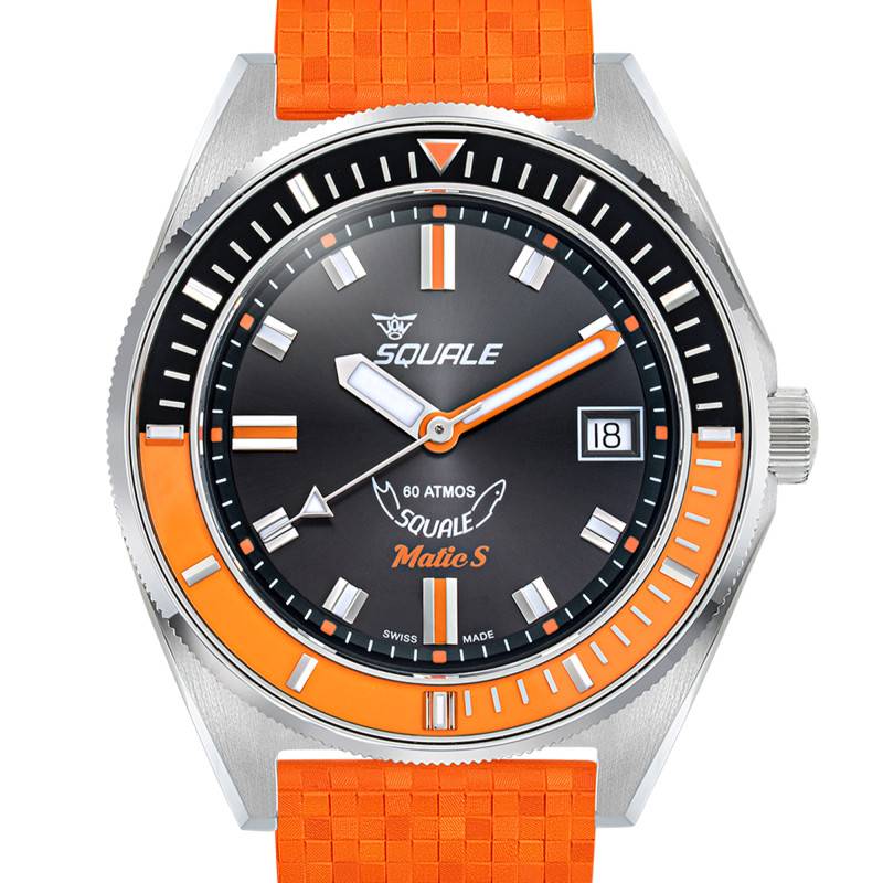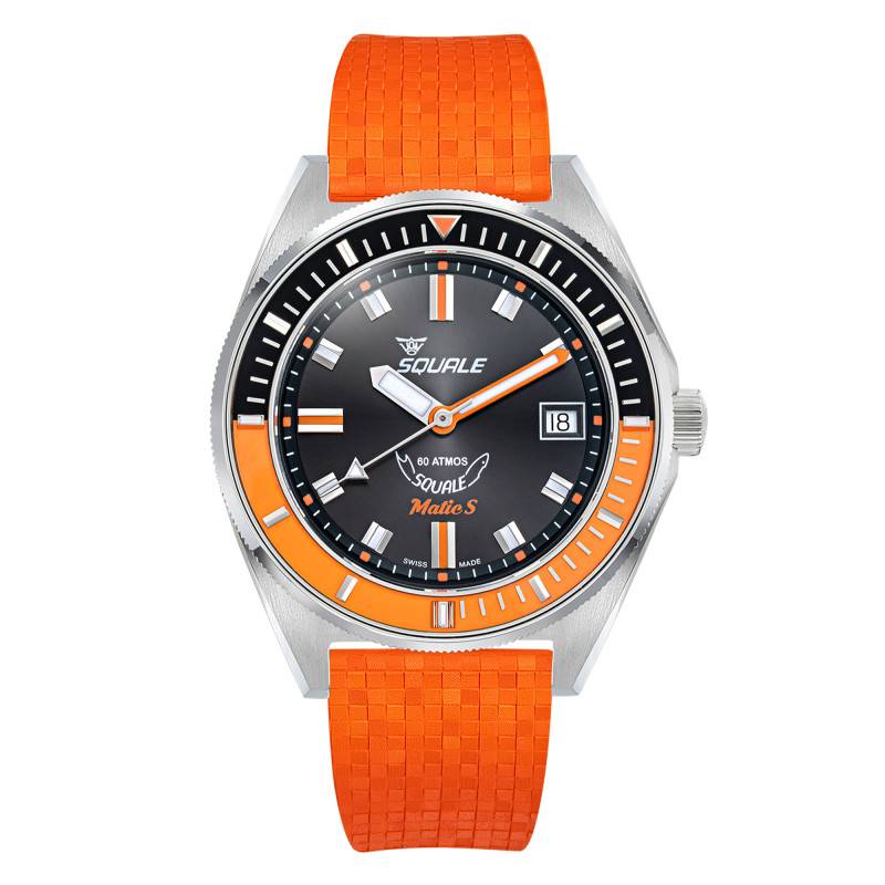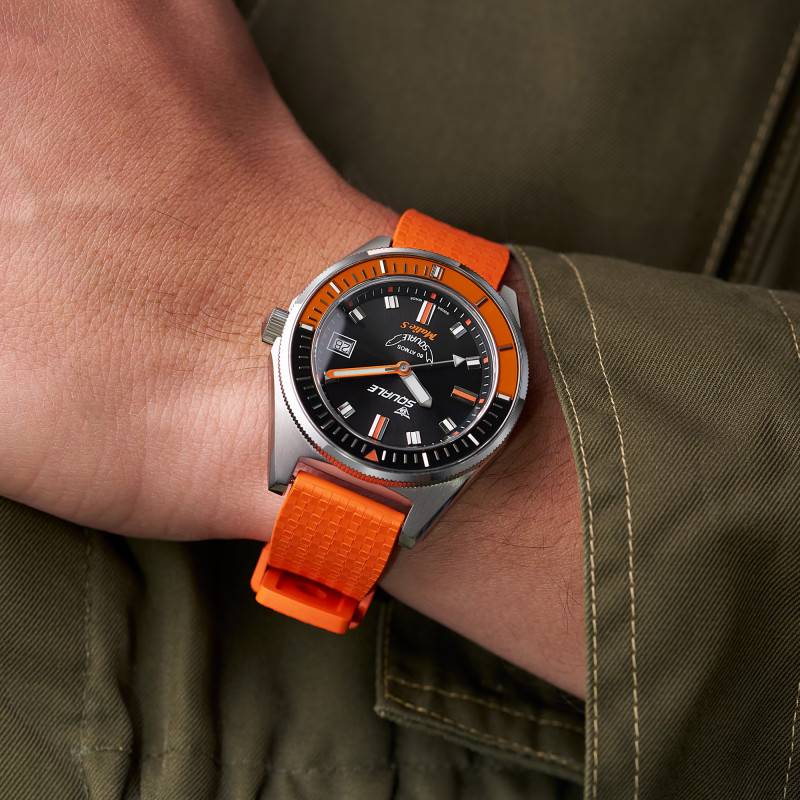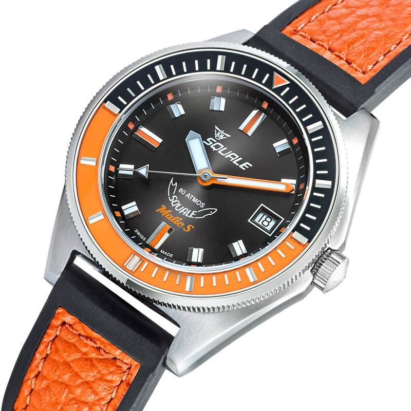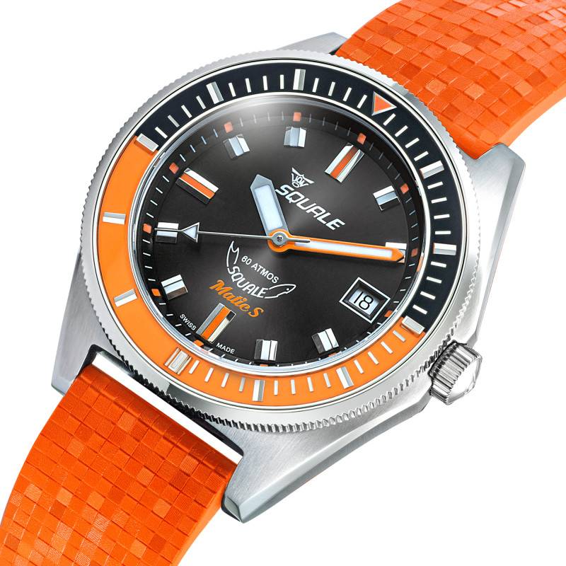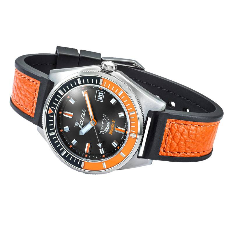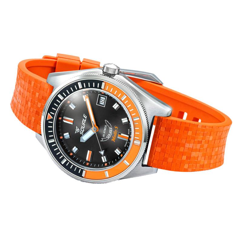 La Squale est proposée avec deux types de bracelets distincts, chacun apportant son style unique et ses avantages. Le premier, le Mosaic Texture Rubber Strap, est conçu en caoutchouc orange avec une texture mosaïque durable et résistante, idéal pour les conditions humides et l'utilisation sportive. Le second, le HydroLeather Strap, ajoute une touche de luxe avec son caoutchouc noir associé à des inserts orange en cuir de bovin résistant à l'eau. Les bracelets s'attachent grâce à une boucle ardillon, offrant une sécurité et un style parfaits pour une finition sportive et élégante.