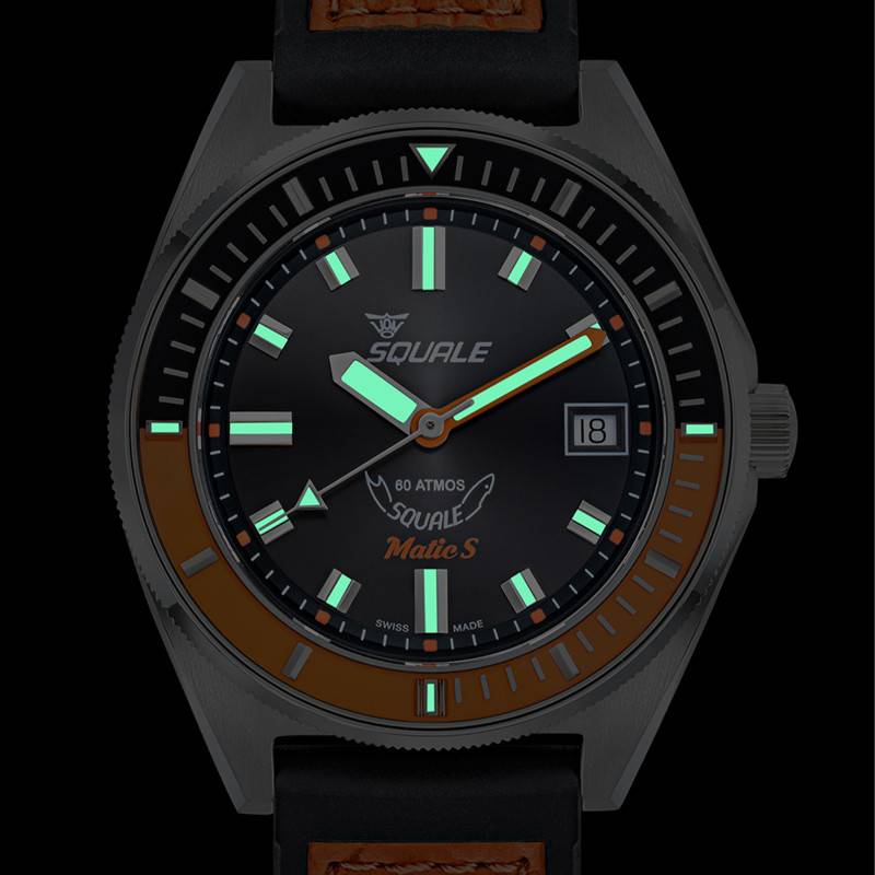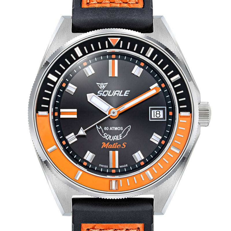 Le cadran de la montre Squale est un magnifique exemple de l'art horloger moderne. Avec sa finition soleillée, il reflète la lumière d'une manière luxueuse, créant des jeux visuels captivants qui attirent inévitablement l'œil. Le fond noir sombre est rehaussé par des touches orange vives, notamment sur l'anneau extérieur et les marqueurs d'index, conférant à la montre une esthétique audacieuse et sportive. Les aiguilles, tout aussi remarquables, sont enduites de matière luminescente SuperLuminova C3, assurant une lisibilité parfaite même dans les environnements les moins éclairés. Un discret guichet date situé à 3 heures s'intègre harmonieusement dans le cadran, ajoutant une fonctionnalité pratique à cet ensemble déjà bien pensé.