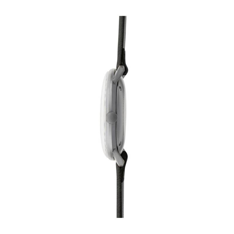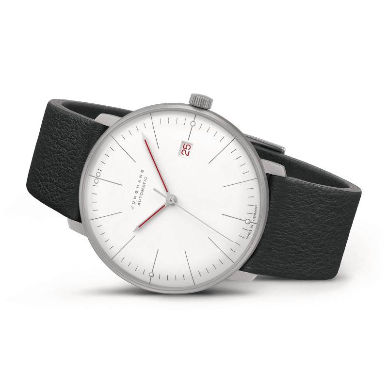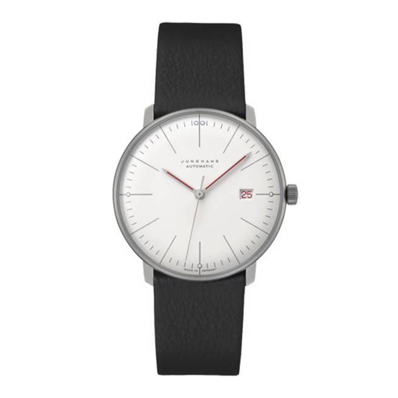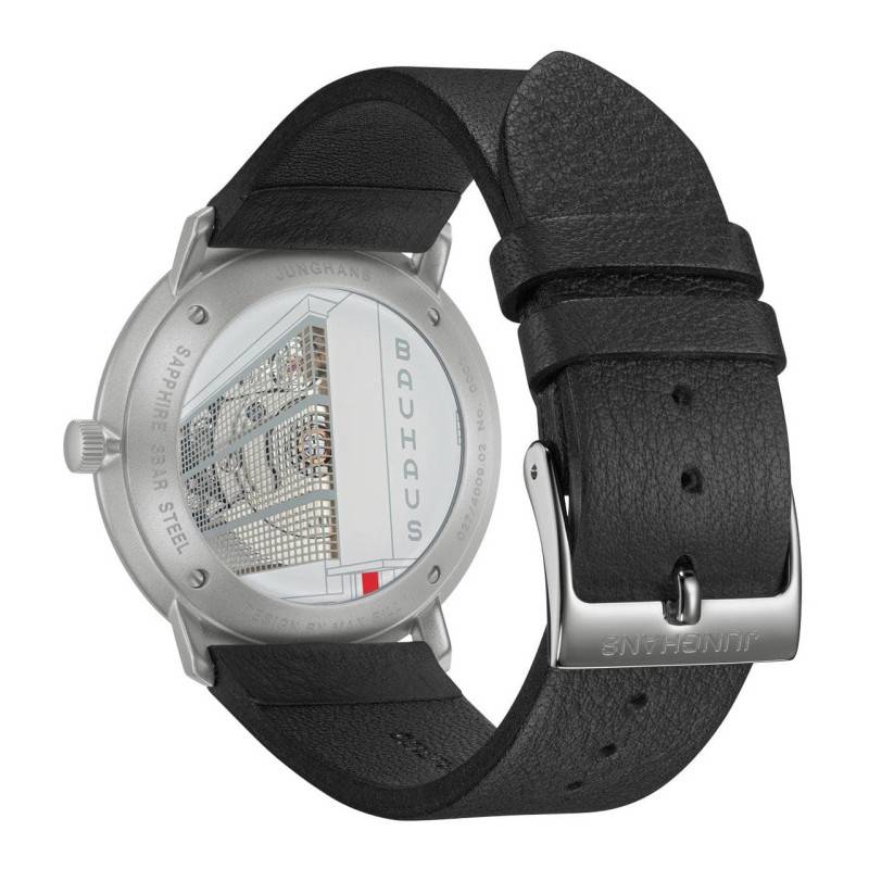 Junghans nous gratifie de montres d'une exceptionnelle qualité et d'un design remarquable au travers de sa collection Max Bill. Inspiré de la mouvance Bauhaus pour laquelle la fonction devait déterminer la forme de l'objet, ce garde-temps offre des lignes simples, élégantes et surtout intemporelles. Son boîtier rond en acier inoxydable propose un diamètre contenu de 38 mm et une épaisseur de 9,7 mm, ce qui est en parfaite adéquation avec l'élégance de cette montre. Le boîtier en acier bénéficie d'une finition sablée et est coiffé d'un verre saphir bombé traité anti-reflets bi face. Le fond de la montre, maintenu par quatre vis, présente une jolie représentation stylisée du bâtiment iconique Bauhaus de Dessau et l'on peut observer le mouvement automatique au travers des fenêtres du bâtiment.