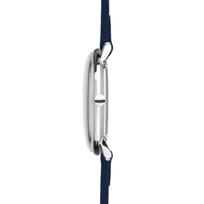 Accompagnant la boîte et le cadran, le bracelet est fabriqué en cuir de bovin de couleur bleue. La largeur de 17 mm est conçue pour s'harmoniser parfaitement avec les dimensions de la boîte, offrant un équilibre visuel et physique. La fermeture se fait par le biais d'une boucle ardillon classique, permettant un ajustement personnalisé et sécurisé autour du poignet.